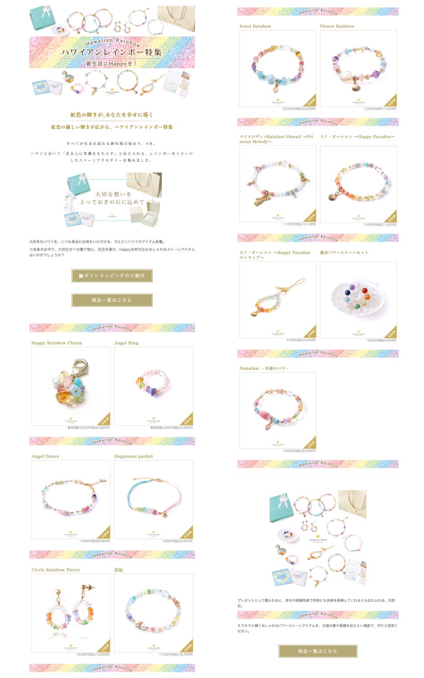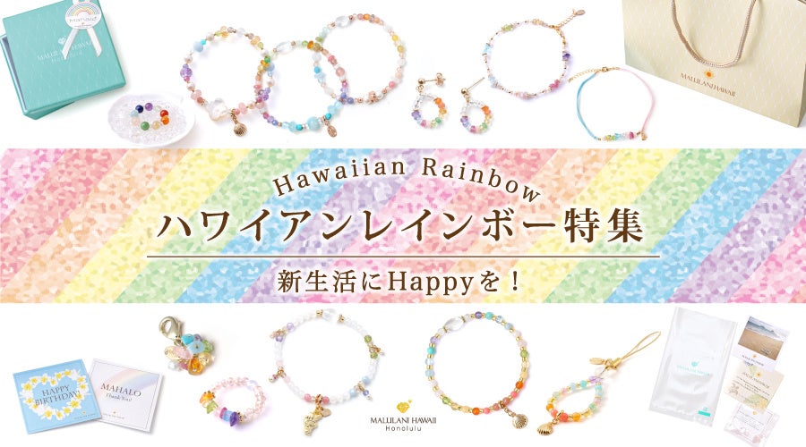 幸運を運ぶハワイのレインボーをイメージした鮮やかな虹色のパワーストーンアイテムが勢揃いした「ハワイアンレインボー特集」が、幸運をもたらすと評判のハワイ発ジュエリーブランド「マルラニハワイ」でスタート。