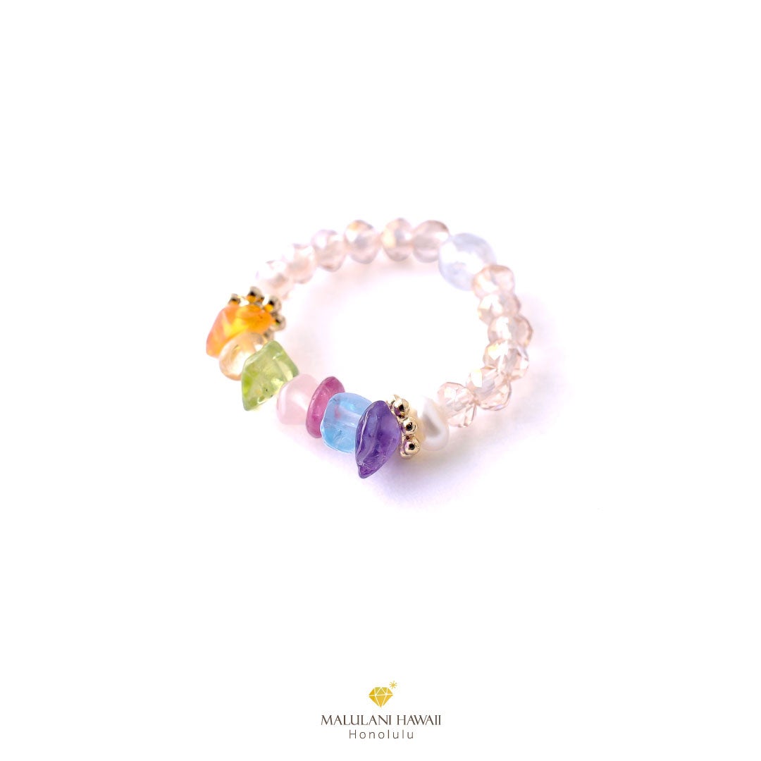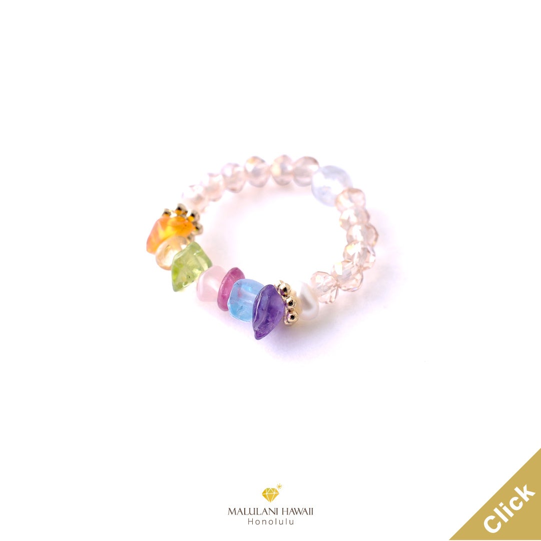 「幸運を招く」と伝えられるハワイの虹をイメージした、美しいグラデーションの可憐なリング。