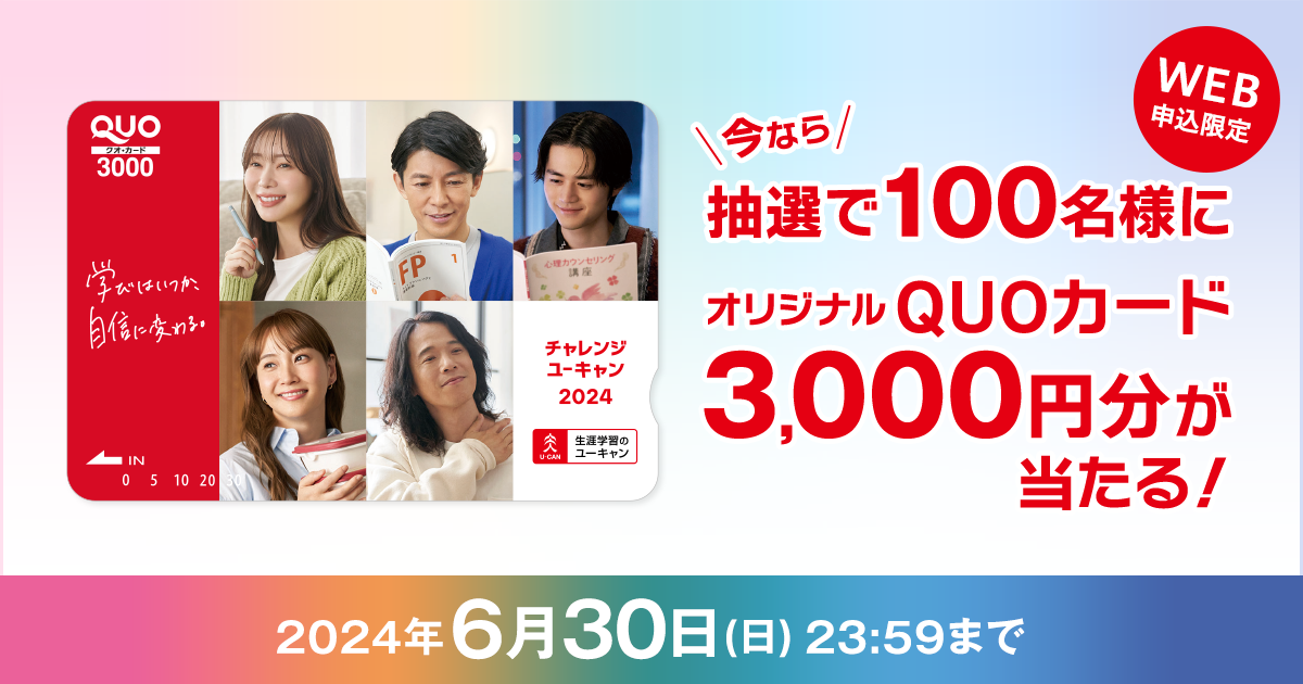 通信教育を手掛ける株式会社ユーキャン(東京都新宿区、代表取締役社長:品川 泰一)は、2024年6月3日(月)より、抽選で100名様に3,000円分のQUOカードが当たる『オリジナルQUOカードプレゼントキャンペーン』を開始しました。