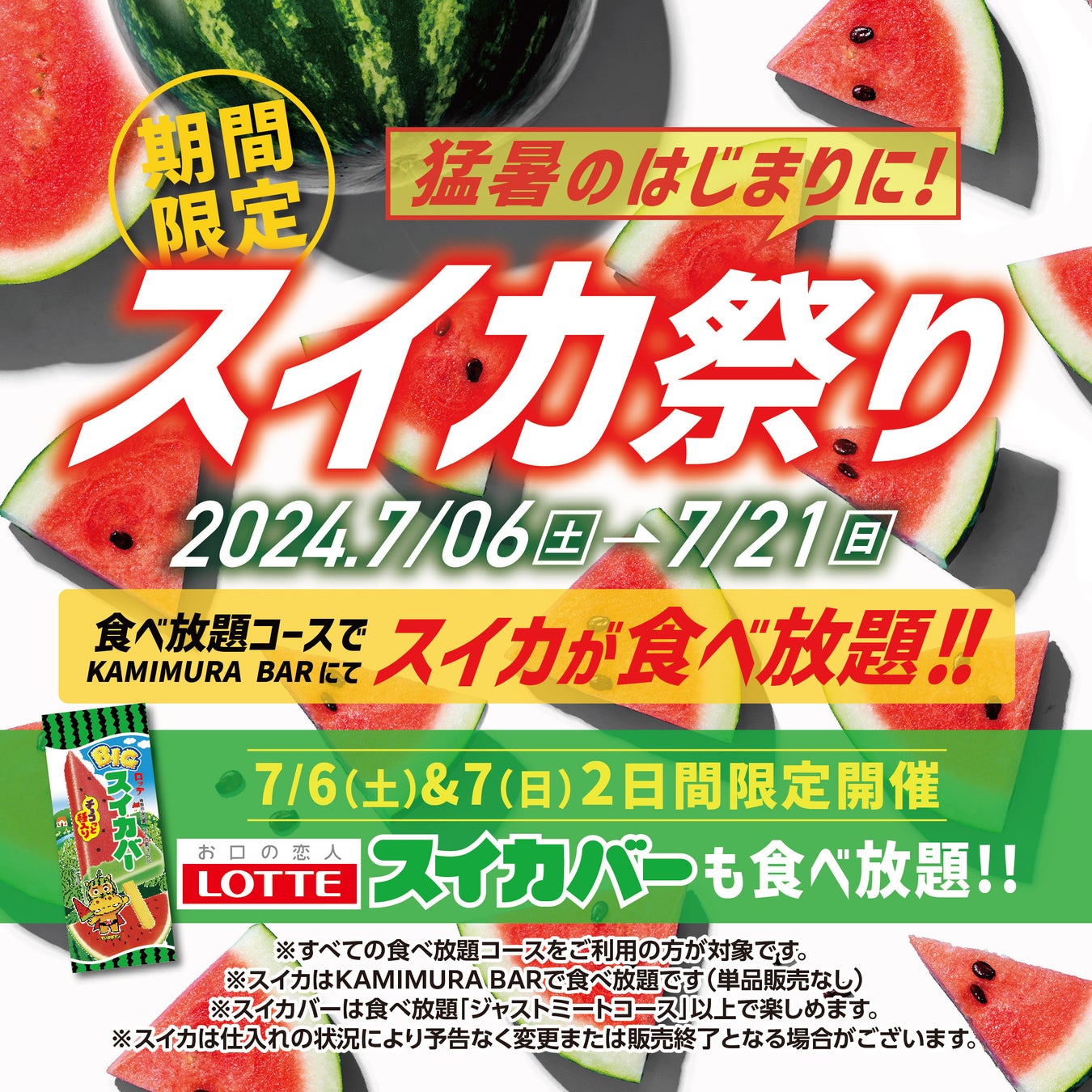 ◆内容:すべての食べ放題コースでお楽しみいただける新鮮なサラダやデザート、アイスまで食べ放題のKAMIMURA BARにて「スイカ」が食べ放題、さらに7月6日(土)と7日(日)の2日間限定で食べ放題「ジャストミートコース」以上のご注文で「スイカバー」も食べ放題としてお楽しみいただけます。※「スイカバー」の食べ放題はお席でタッチパネルからのご注文で提供をさせていただきます。(スイカもスイカバーも単品販売はありません)