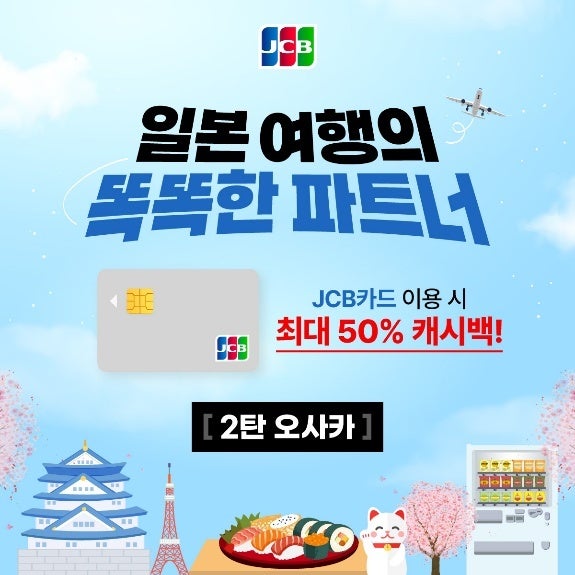 日本発唯一の国際カードブランド運営会社である株式会社ジェーシービー (本社:東京都港区、代表取締役会長兼執行役員社長:二重 孝好) の海外業務を行う子会社、株式会社ジェーシービー・インターナショナル(本社:東京都港区、代表取締役社長:陽川 勝樹)(以下、総称してJCB)は、2025年4月1日から、韓国で発行しているJCBカード会員様向けに日本での利用に対するキャッシュバックキャンペーンを実施しております。日本全国キャンペーンとエリア別キャンペーンの2種類を実施しており、4~6月の福岡キャンペーンが好評だったため、このたびエリア別キャンペーンの第2弾として大阪エリアを中心としたキャンペーンを開始いたします。