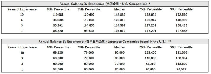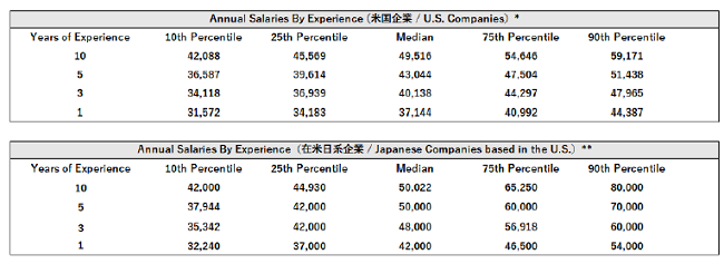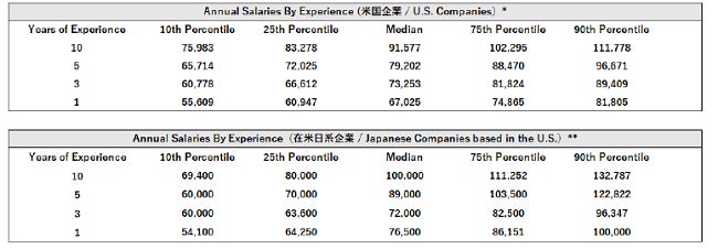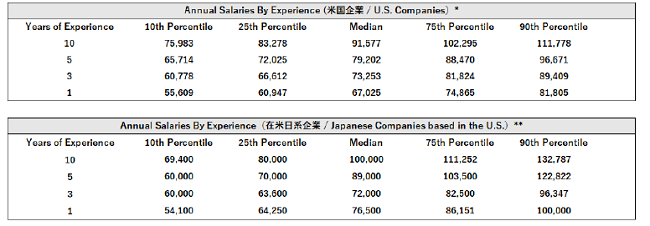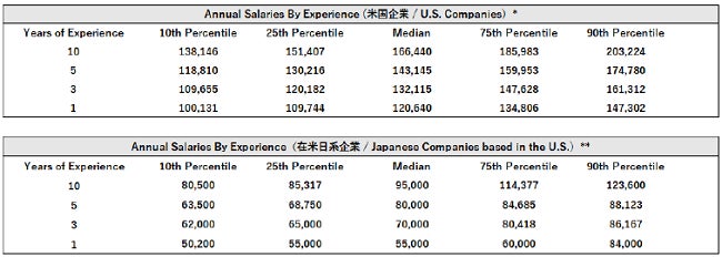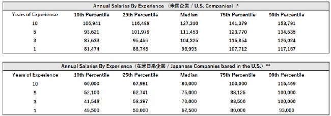 ※米系企業を含む全米・全産業平均の給与(米国企業/上段)と、米国内の日系企業の平均給与 (在米日系企業/下段)それぞれの企業職種別給与範囲を示す