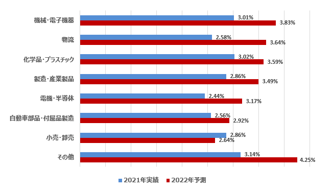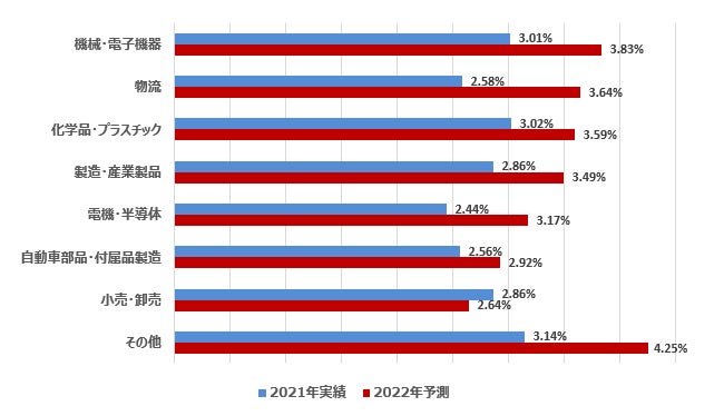■ 2022 年の予測昇給率は小売・卸売が 2021 年と比較し下回る他は、物流、電機・半導体などの業種で大幅に伸長の見込み。