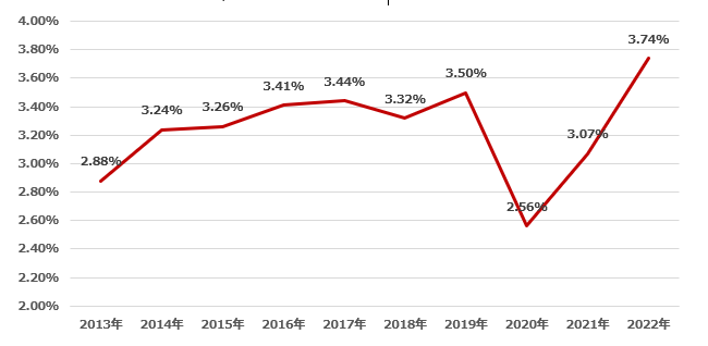■ 2022年の昇給率は過去 10 年間で最高の 3.74%となる見込み。 コロナ禍で大きく落ち込んだ 2020 年の 2.56%より大幅に回復。