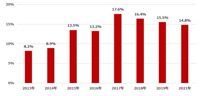 - 2021 年の離職率は 14.8%。コロナ前の 2019 年に比べ 0.7 ポイント低下。