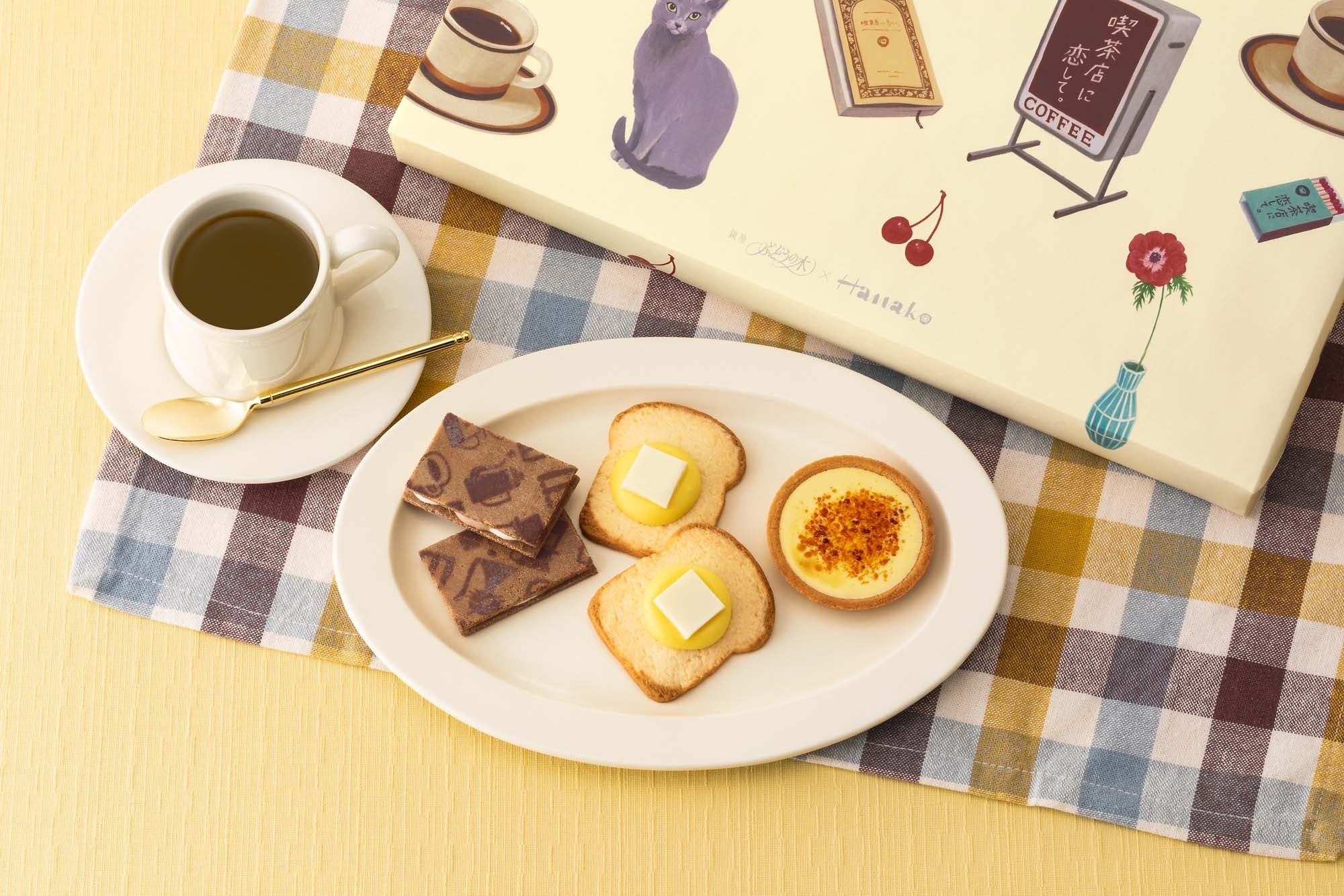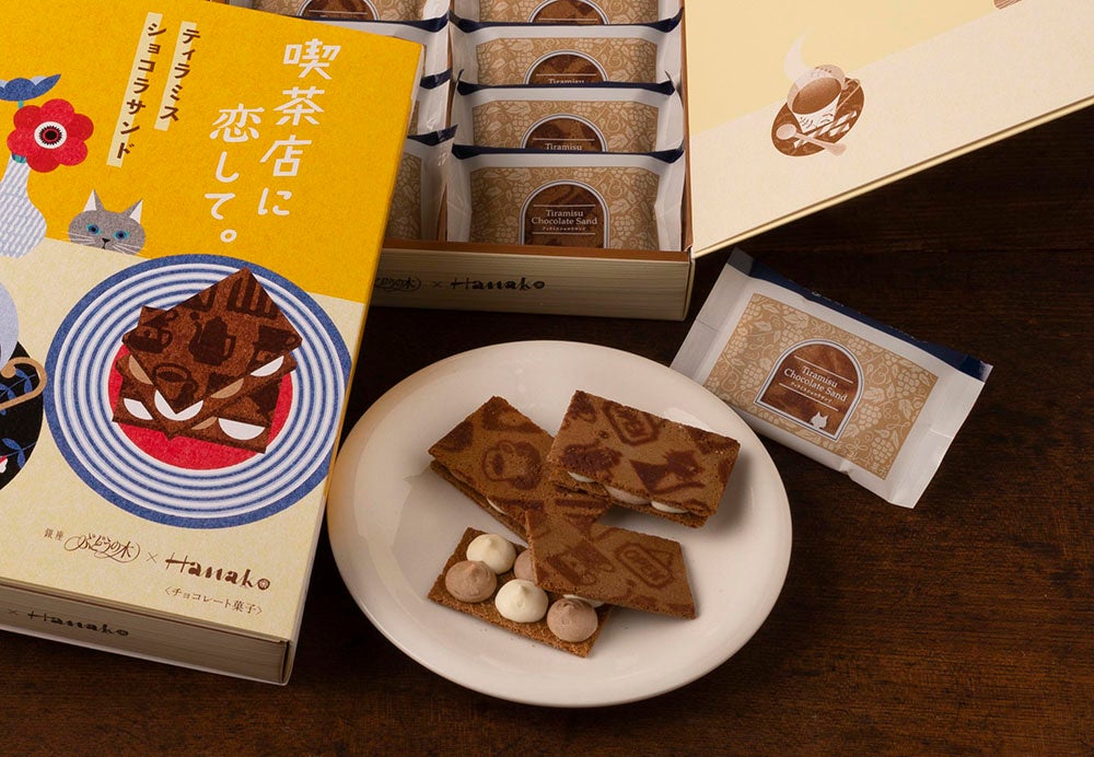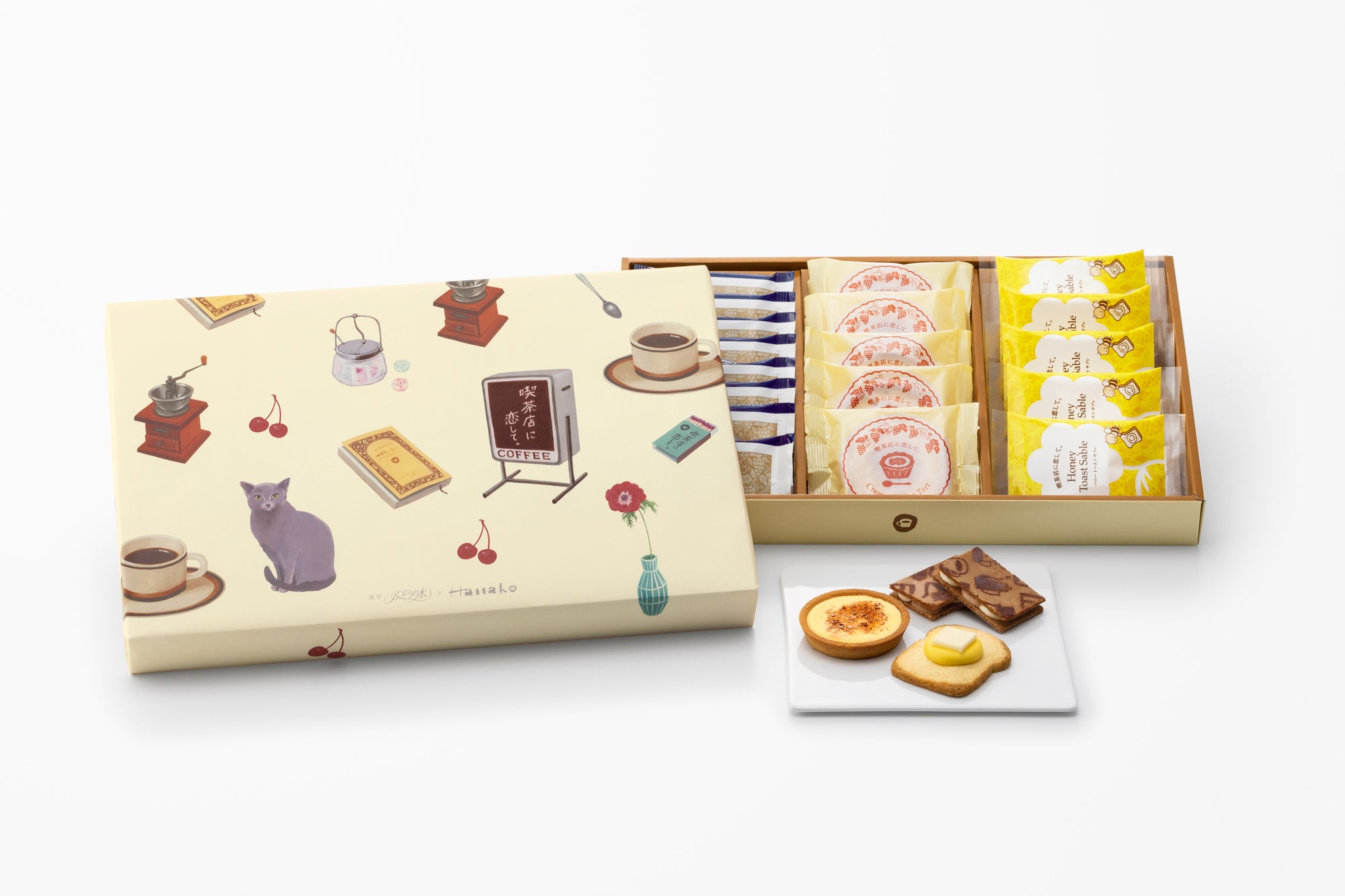 『喫茶店に恋して。』の世界を満喫できる“喫茶スイーツボックス”も登場。ブランド誕生から人気の『ティラミスショコラサンド』、パリとろ食感がたまらない『クレームブリュレタルト』、そして最新作の『ハニートーストサブレ』を一度に楽しめるレトロ可愛いセットです。喫茶店の扉を開ける時のワクワク感を感じていただきたくて、とびっきりかわいい喫茶シーンを一面に描いたパッケージでご用意いたしました。雰囲気のある店先看板、入口からあふれるコーヒーの香り、クラシックな店内に挿す一輪の花、近寄ったり離れたりの気まぐれ猫ちゃん…。キュートなモチーフの数々は人気イラストレーターの進藤恵子さんによるイラスト。どこか見覚えのある喫茶店の風景や懐かしい思い出が詰まった、喫茶ファン必見のスイーツボックスです。
