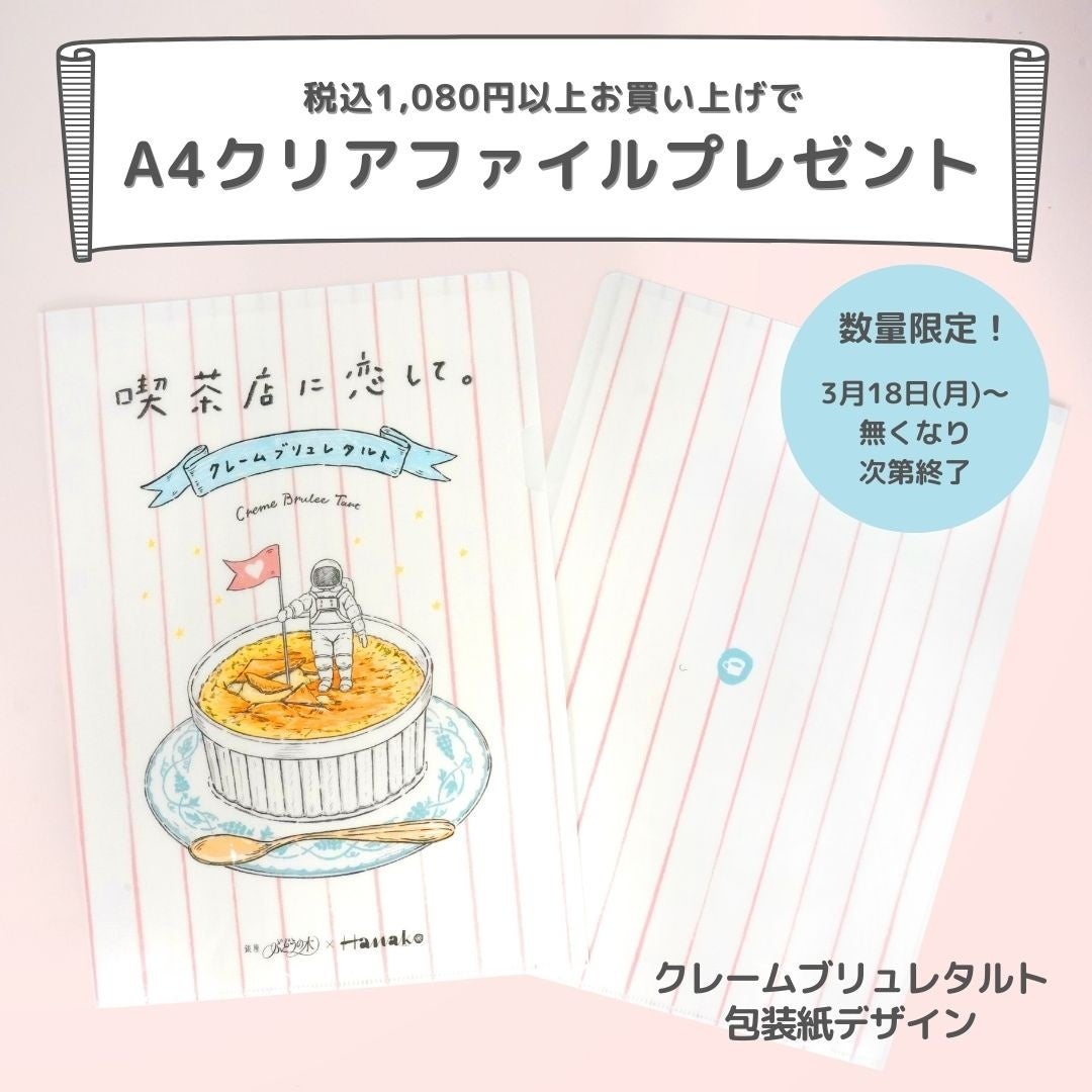 【内 容】「喫茶店に恋して。エキュート大宮 ノース店」にて商品を税込1,080円以上お買い上げのお客様にクレームブリュレタルト包装紙柄のA4クリアファイルをプレゼント。