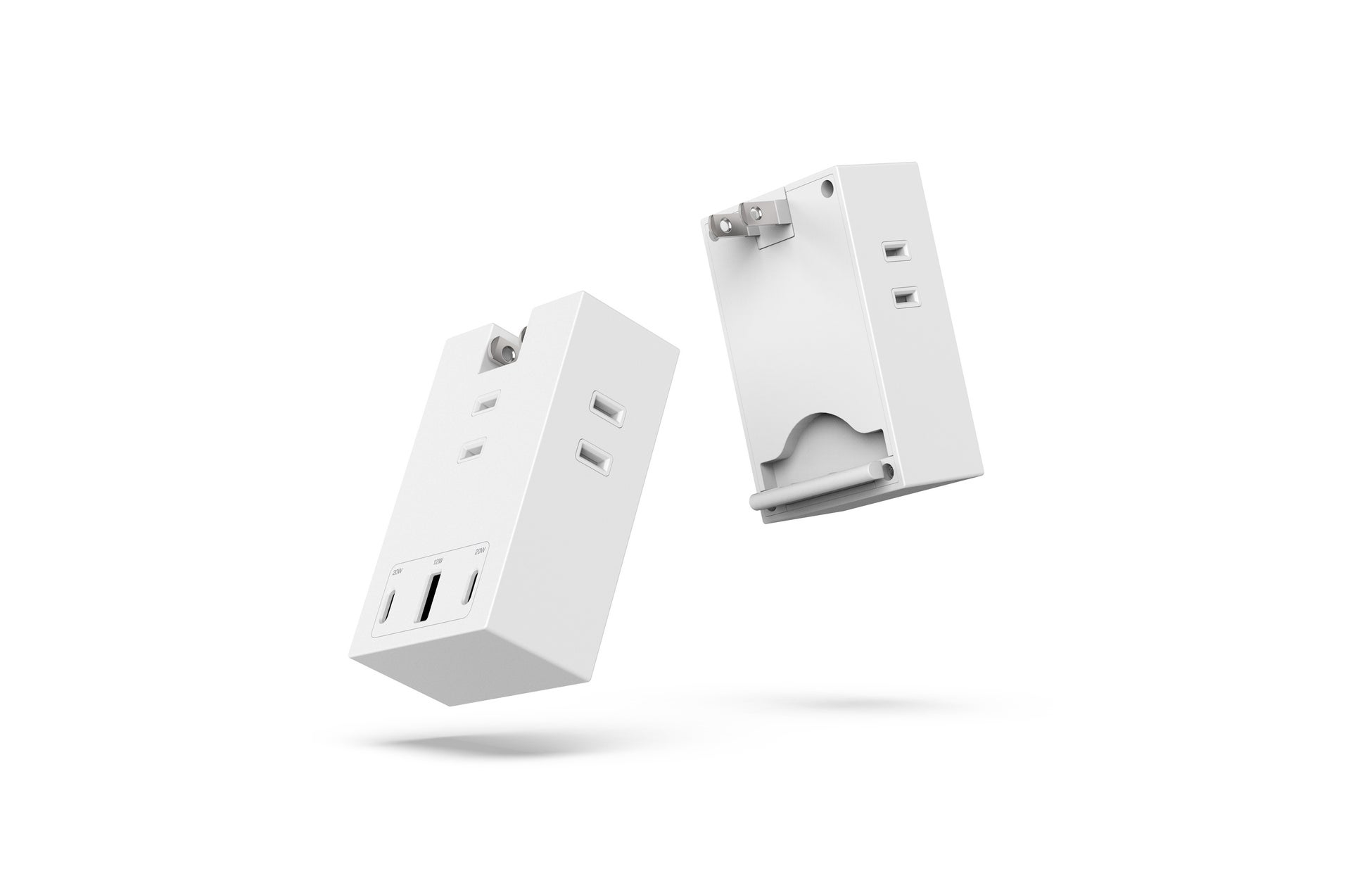スマートフォンやタブレットなどの充電がこれ1台で完結する、モバイルUSBタップです。最大6台のデバイスが接続でき、コンセントの少ない場所で活躍します。設置時にコンセントカバーと壁との段差でガタつき、プラグが抜けそうになるのを防ぐサポートバーを搭載しています。
