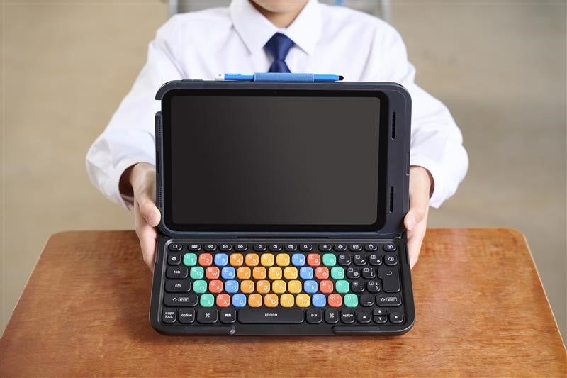 正しいキー入力を楽しく覚えられる、はじめてキーボードに触れる子どもたちが進んで学習したくなる工夫を凝らした"キーパレット"と、iPadケースが一体に。ワクワクするデザインを大切に守りながら、教室でも屋外でも便利で安全に使える工夫を詰め込みました。高耐久かつ万全のサポート体制で先生も一緒に使えるよう配慮し設計しました。