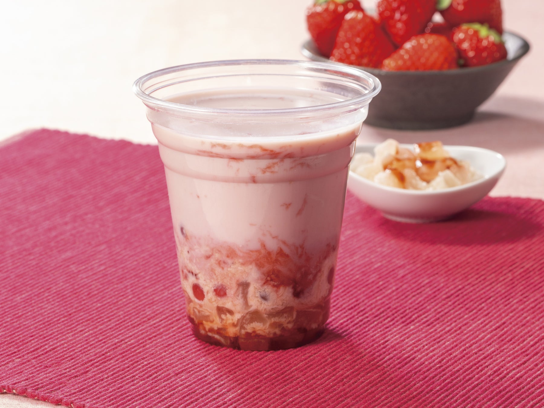 苺と練乳を合わせた豆乳ラテに、苺風味のわらび餅を合わせたデザートドリンクです。