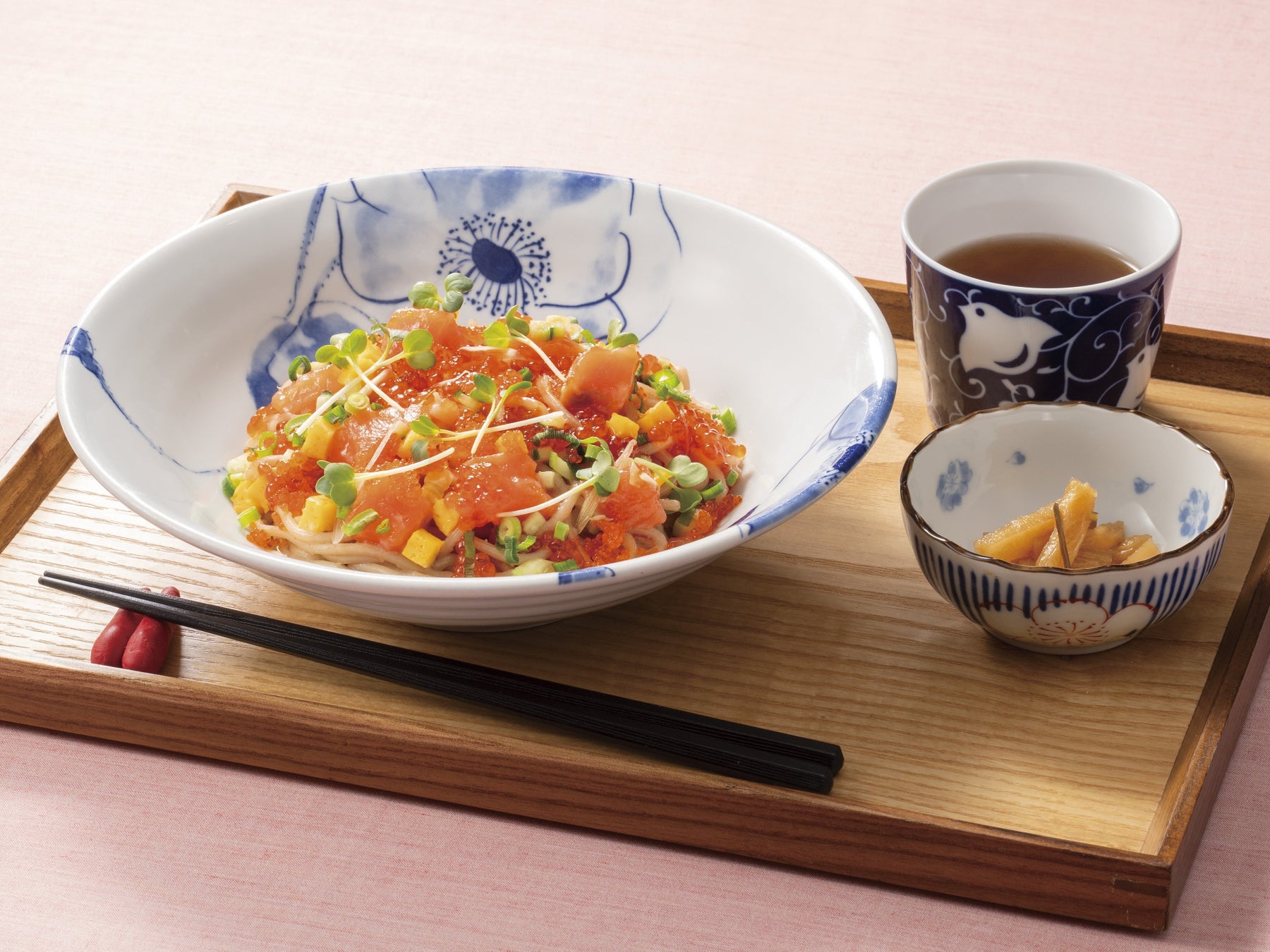 たらこスパゲティの上に、サーモン、いくら、とびっこ、きゅうり、玉子焼き、ねぎ、ブロッコリースプラウトを散りばめた、ちらしずし風の一皿です。彩り豊かな具材を合わせることで、見た目にも華やかな「春のおとずれ」に相応しい季節限定メニューに仕上げました。