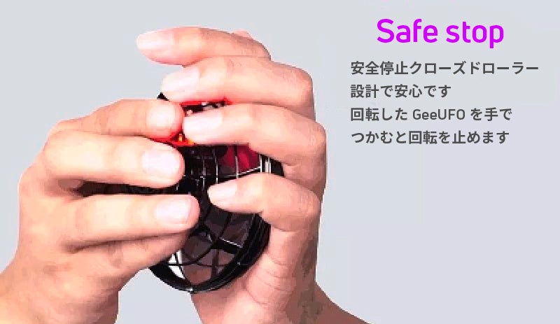 回転したGeeUFOを握ると、本体が回転を止める安心停止クローズドローラー設計です。柔軟で強固なボディで、長く安心して遊ぶことができます。