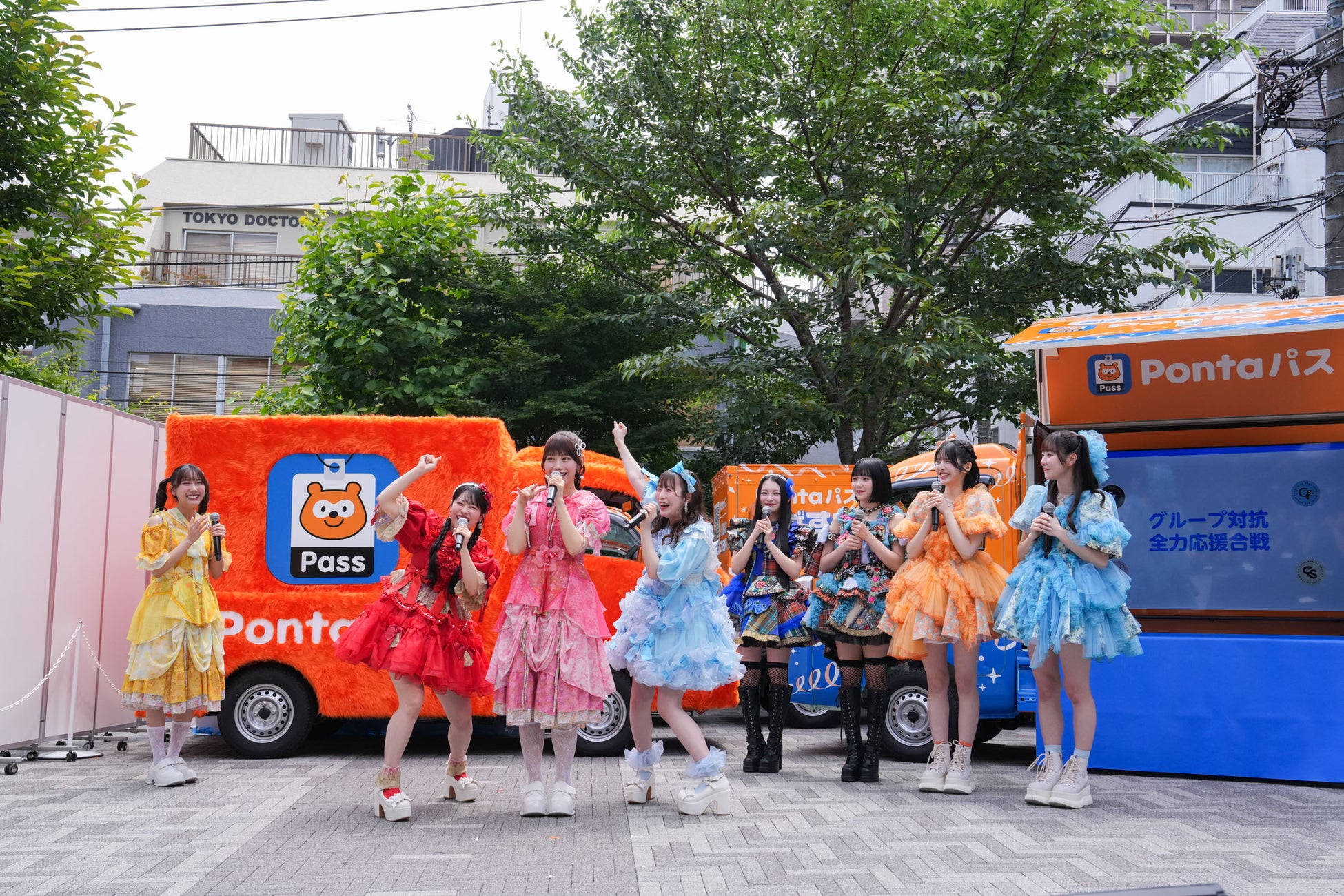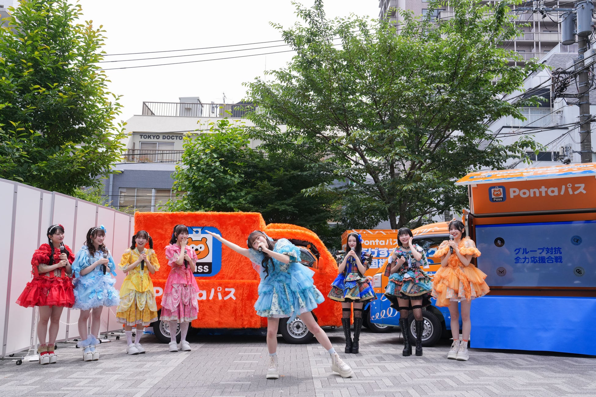 横断に伴い、5月29日に「ポンポンあげすぎトラック」の出発式を東京都渋谷区の北谷公園にて実施しました。出発式には、長谷部渋谷区長やダブルタッチ世界王者のREG☆STYLEの皆さんのほか、この度「Pontaパス公式コンシェルジュ」に就任いただいたSWEET STEADY 白石まゆみさんと、その応援としてKAWAII LAB.からFRUITS ZIPPERの鎮西寿々歌さん・真中まなさん、CANDY TUNEの桐原美月さん・福山梨乃さん、SWEET STEADYの山内咲奈さん、CUTIE STREETの梅田みゆさん・佐野愛花さんにご登壇いただきました。