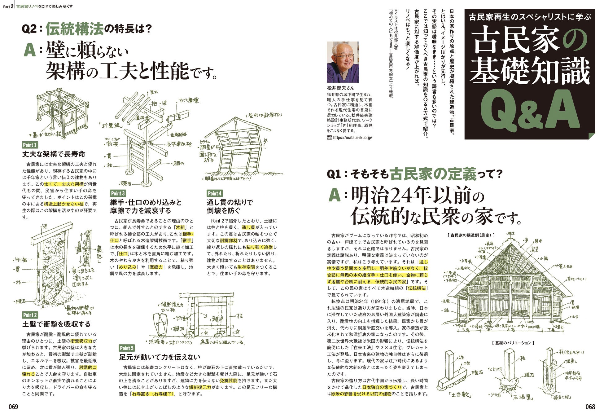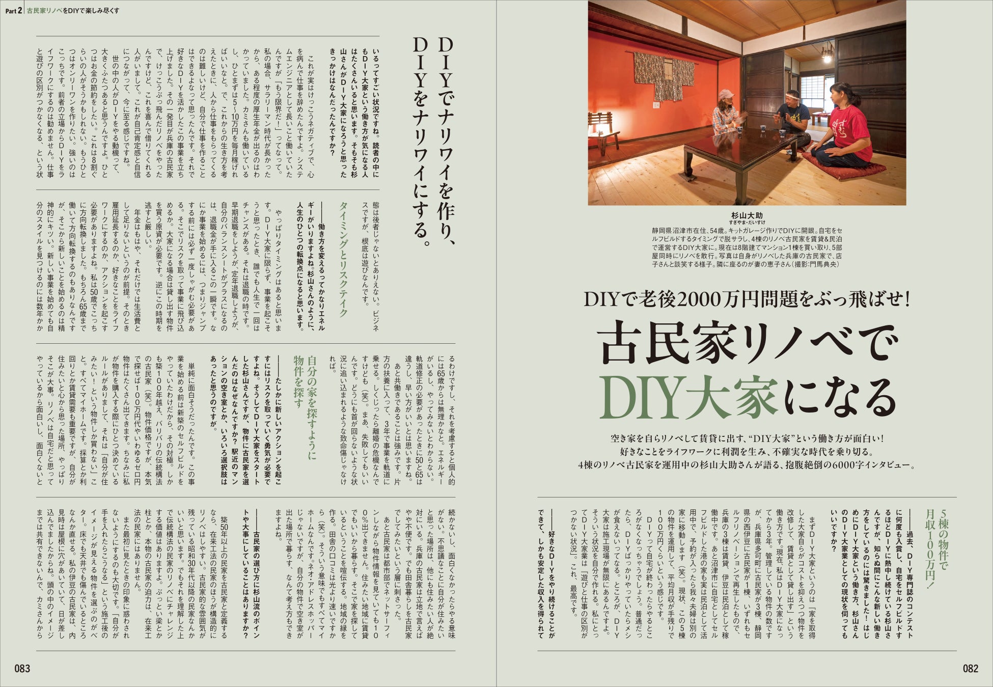 日本の家作りの原点と歴史が凝縮された建造物、古民家。失われつつある現代の建築遺産でもある古民家をDIYリノベという角度から徹底解剖。その定義をはじめ、物件購入のコツから、壊し方、直し方、断熱方法まで……古民家リノベの秘訣を余すことなく公開。また再生した古民家による民泊開業や賃貸営業にもズームイン。自分らしい暮らし方と働き方を両立する、リノベビジネスの魅力にも迫ります。