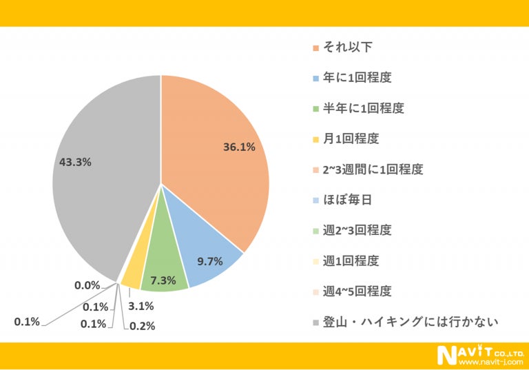 登山やハイキングを行う頻度については、「年に1回以下」が36.1%、「年に1回程度」が9.7%、「半年に1回程度」が7.3%という順になりました。頻度はそこまで多くない方が多いようですね。