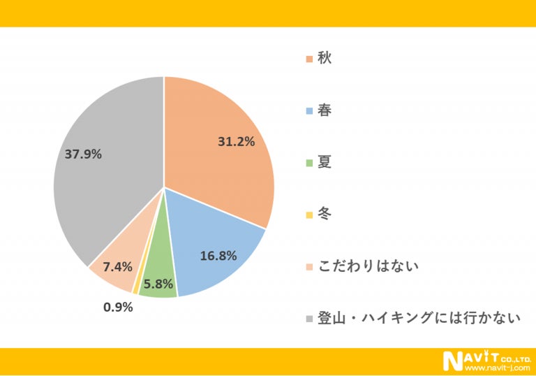 「登山・ハイキングに行くのはどの季節が一番いいですか?」という質問については、「秋」が31.2%、「春」が16.8%、「夏」が5.8%という順になりました。