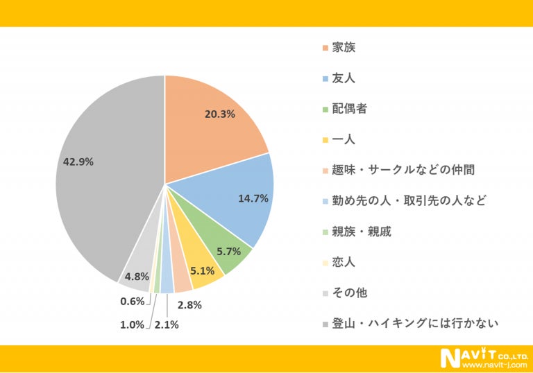 「誰と登山・ハイキングをすることが最も多いですか?」という質問については、「家族」が20.3%、「友人」が14.7%、「配偶者」が5.7%という順になりました。