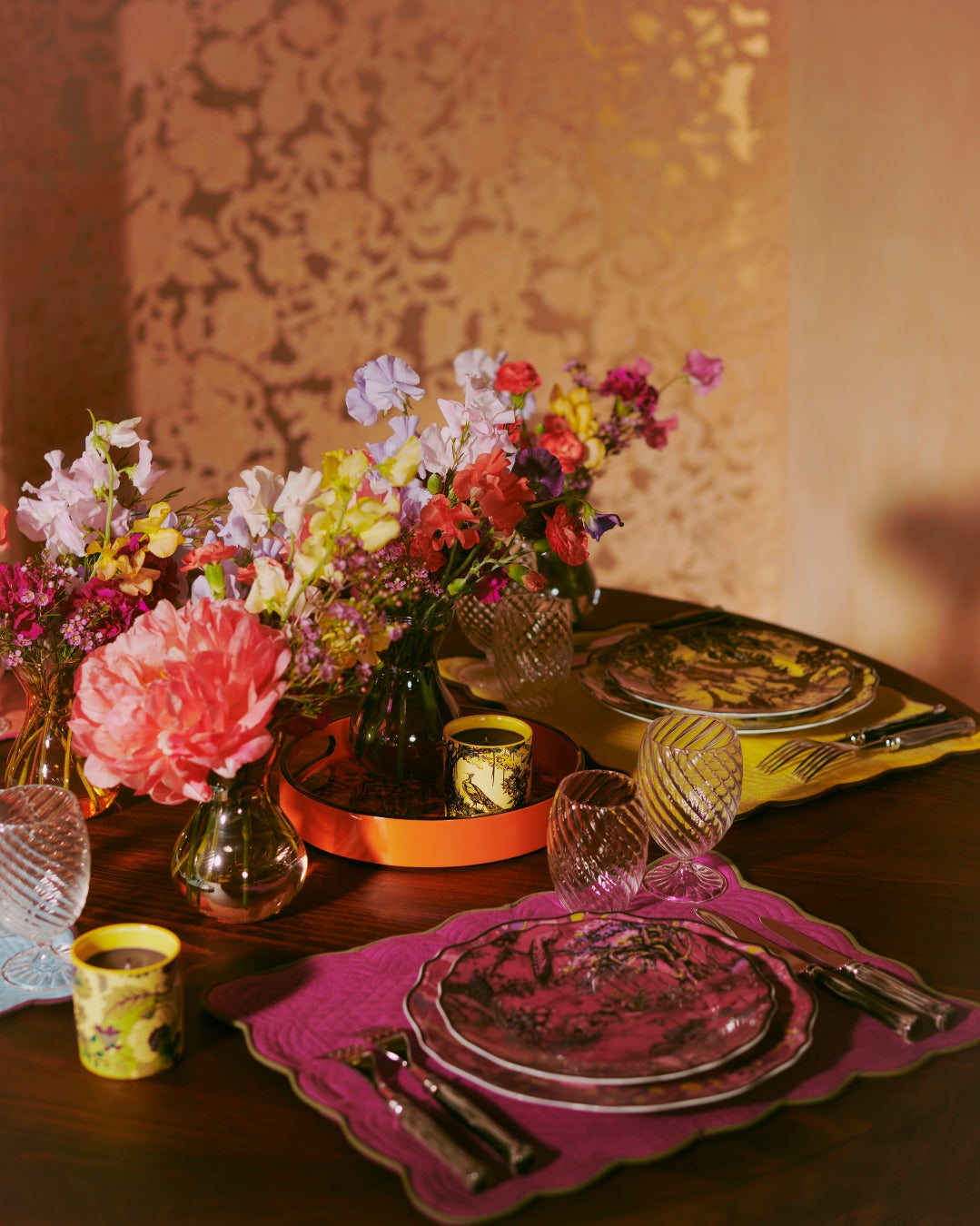 ディオール メゾンより、インドのムンバイで発表された、2023年フォール コレクションにインスピレーションを得た「インディア」コレクションが登場。「ジャルダン アンディアン」のフローラルモチーフと、インドの風景と動植物を再解釈した象徴的な「トワル ドゥ ジュイ」モチーフが、ピンク、イエロー、ブルー、オレンジなど万華鏡のような鮮やかな色彩でクリエイションを彩ります。リモージュ磁器のディナープレートやデザートプレート、ラッカー仕上げの竹製トレイなどのテーブルウェアや刺繍入りクッション、ミニキャンドルに描かれた繊細なスケッチが魅惑的な旅へと誘い、プレートと色調を合わせたプレースマットやガラス製のフラワーベースがこのコレクションを完成させます。「インディア」コレクションは、ディオール メゾン取り扱いブティックおよび公式オンラインブティックにてお求めいただけます。
