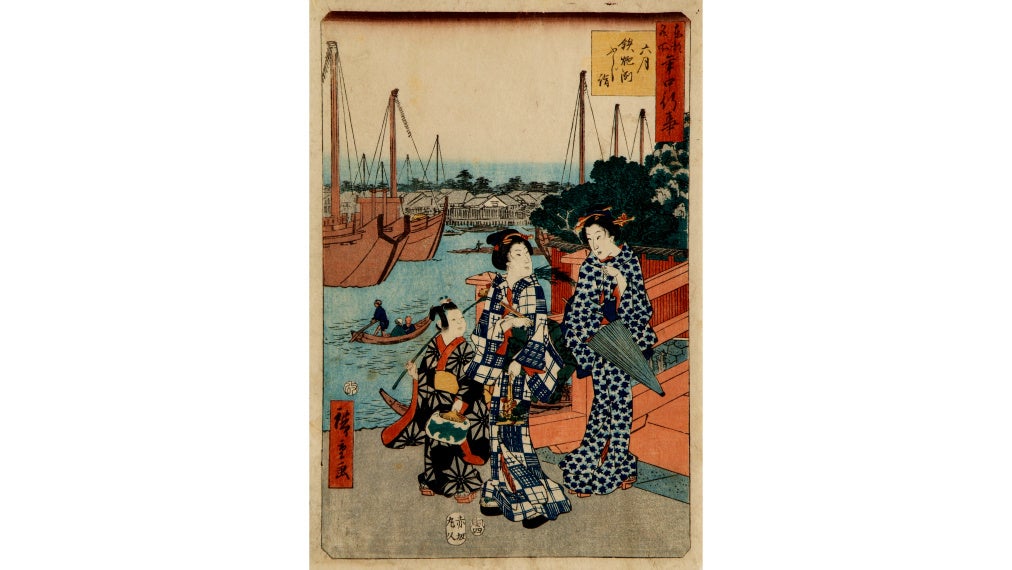 The wisteria is the seasonal symbol of June of the lunar calendar. Teppozu is around the west bank of the Sumidagawa River in present day Chuo district in Tokyo, and is a protruding bank that faces Tsukuda-jima.