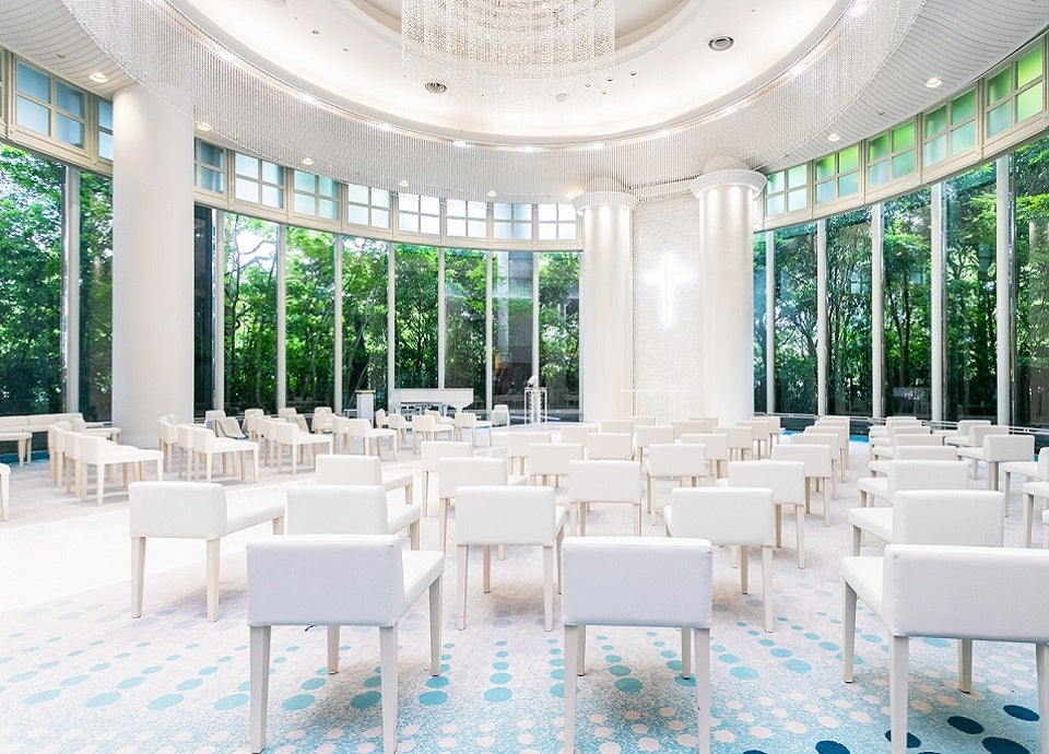 会場となるチャペル リュヴェールは、天井高7m、円形空間を囲む大きな窓の外には鮮やかな緑が広がり、柔らかな木漏れ日がやすらぎを誘う空間。2022年4月1日に株式会社クォーターズが発表した「息をのむほど美しい 日本の美しいチャペルベスト100」にも選出されている当ホテル自慢のチャペルです。