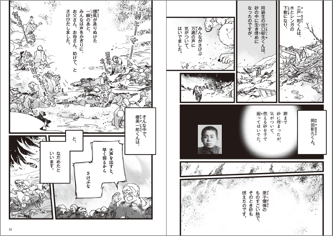 原爆投下前の広島の街並み、そこで暮らす人々、爆心地から約500メートルの場所で被爆した中学生たち、悲惨な被害の実相、必死にわが子を探す親たち、家に帰れた子、帰れなかった子……一人一人の様子が事実を尊重して淡々と描かれており、だからこそ胸に迫る作品となっています。