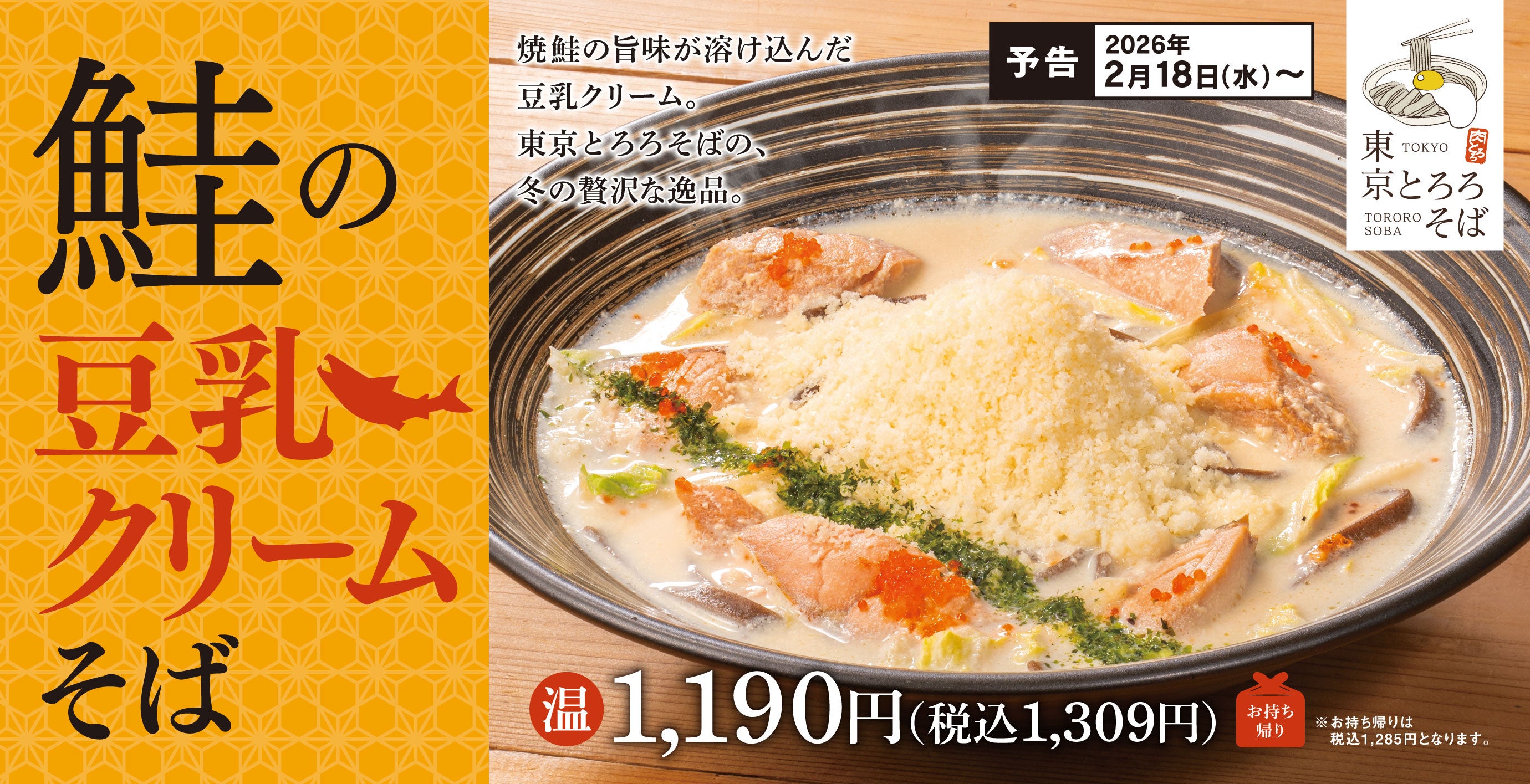 とんかつ専⾨店「かつや」などを展開するアークランドサービスホールディングス株式会社の⼦会社で、「肉めし岡もと」などを運営する株式会社トビラダイニング(本社:東京都千代田区/代表:布施 裕康)は、とろろそば専門店「東京とろろそば」にて期間限定で「鮭の豆乳クリームそば」を2026年2月18日(水)より販売開始いたします。