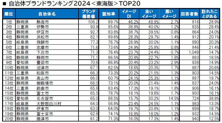 いい部屋ネット「自治体ブランドランキング2024<東海版>」(街の住みここちランキング特別集計)発表