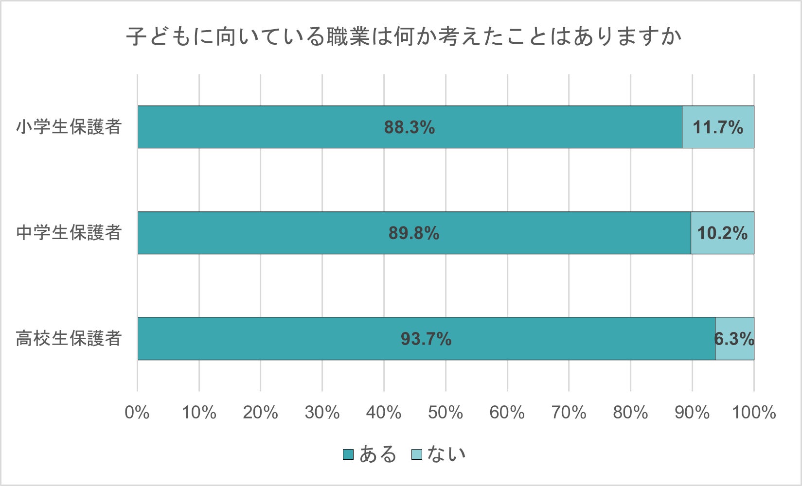 小学1年生~高校3年生の子どもをもつ保護者に、子どもに向いている職業は何か考えたことがあるかを聞いたところ、小学生保護者の88.3%、中学生保護者の89.8%、高校生保護者の93.7%が「ある」と回答した。