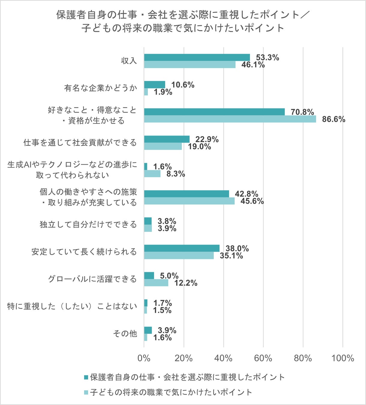 「保護者自身が今までに就いたことがある仕事・会社を選ぶ際に重視したこと」、および、「将来子どもが就く職業について、保護者として気にかけたいポイント」を聞いた。