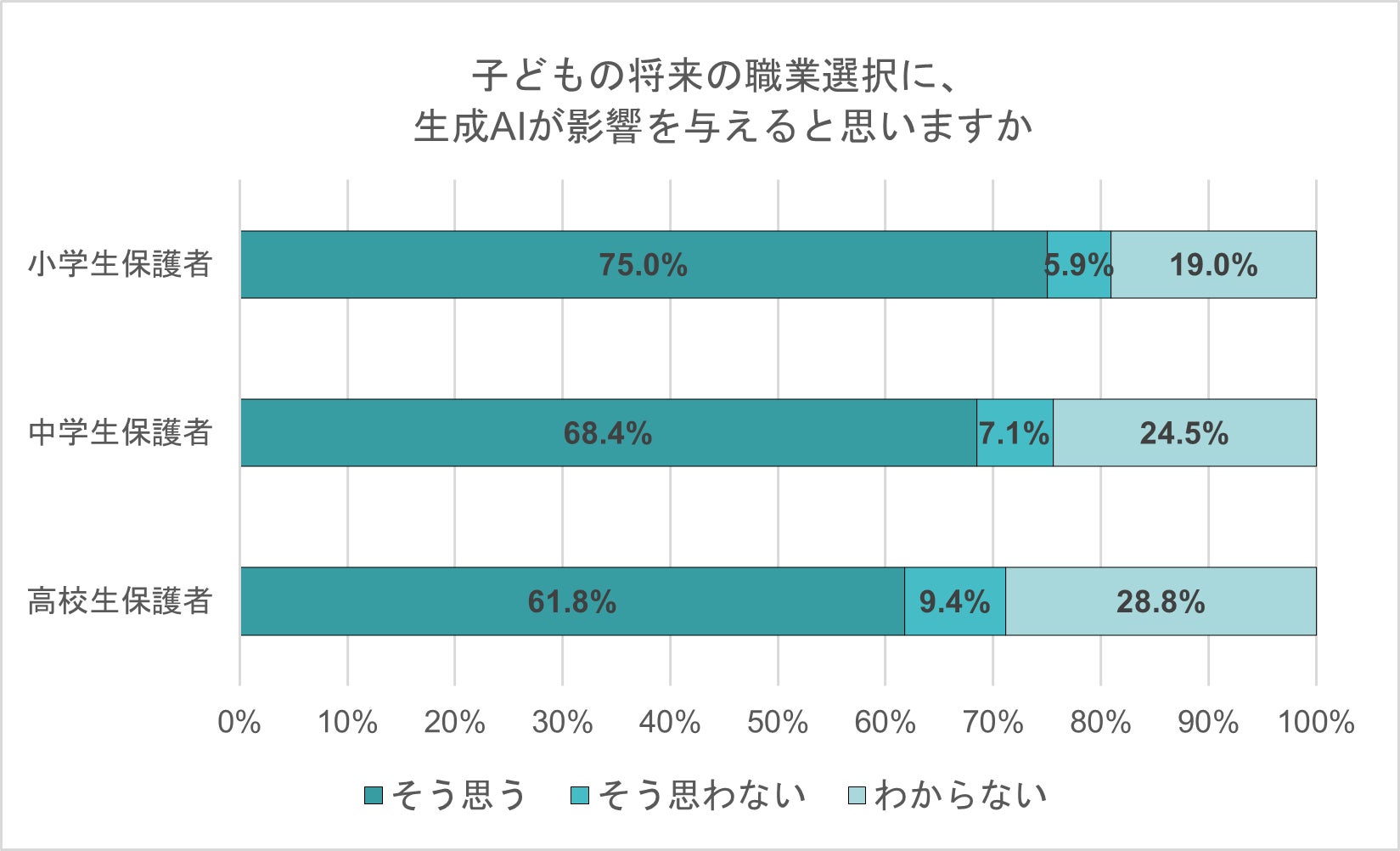 一方で、子どもの将来の職業選択に与える影響については、「そう思う」と回答した保護者が多く、小学生保護者では75.0%にのぼった。