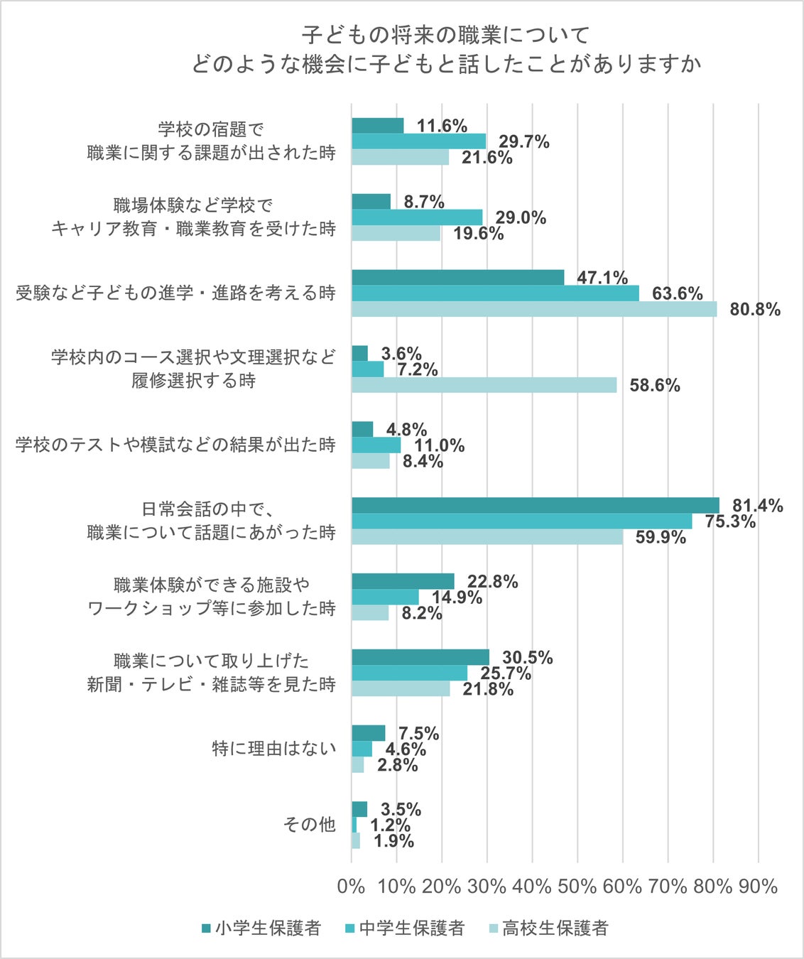 次に、「話したことがある」と回答した保護者に、どのような機会に子どもと話したことがあるかを聞いた。小学生保護者では「日常会話の中で、職業について話題にあがった時」がもっとも多く81.4%だった。中学生保護者では小学生保護者よりは割合は低いものの「日常会話の中で、職業について話題にあがった時」がもっとも多く75.3%、高校生保護者は「受験など子どもの進学・進路を考える時」がもっとも高く、80.8%だった。また、高校生では、「学校内のコース選択や文理選択など履修選択をする時」も約6割にのぼった。