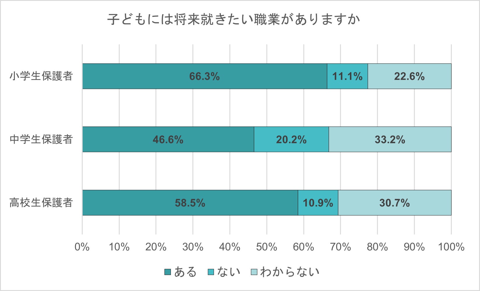 保護者に、子どもには将来就きたい職業があるか聞いたところ、小学生保護者の66.3%、中学生保護者の46.6%、高校生保護者の58.5%が「ある」と回答した。
