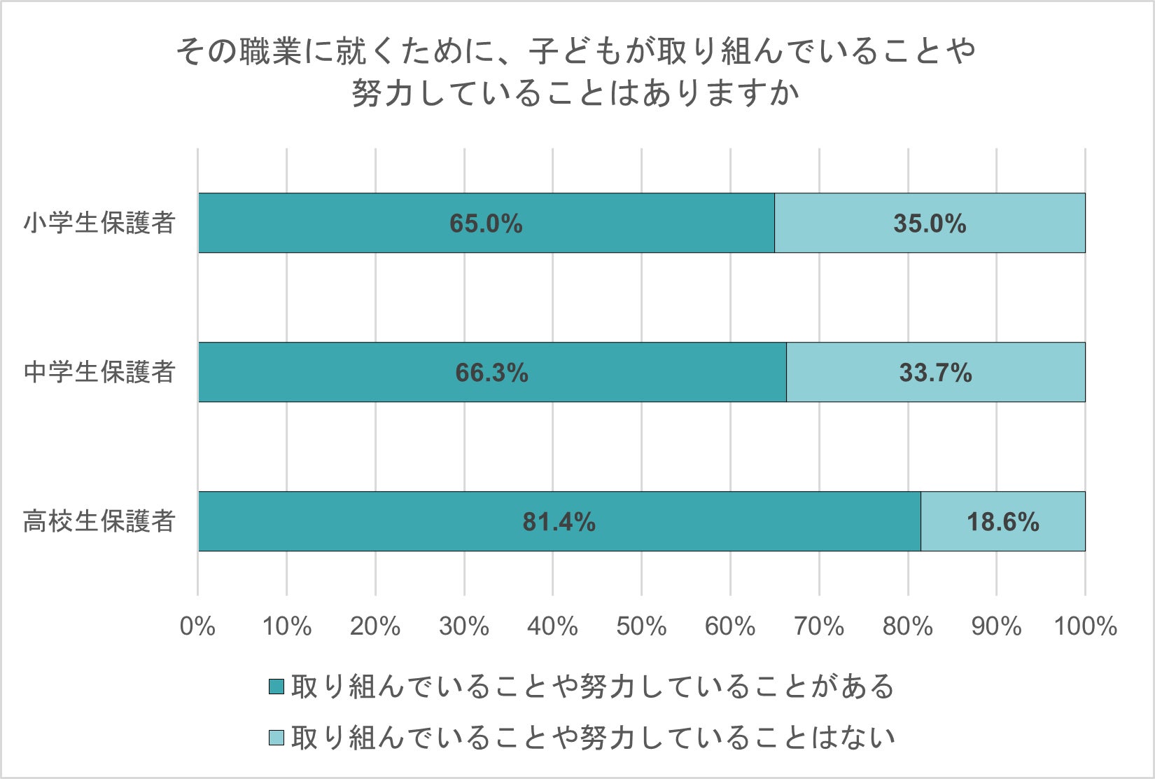 子どもに将来就きたい職業があると回答した保護者に、その職業に就くために、子どもが取り組んでいることや努力していることがあるかを聞いた。小学生保護者の65.0%、中学生保護者の66.3%、高校生保護者の81.4%が「取り組んでいることや努力していることがある」と回答した。将来就きたい職業がある子どもは、その目標に向かって努力する傾向が大きいことが分かった。特に高校生においては、将来の職業が小学生・中学生よりも具体的になり、その実現に向けて取り組んでいることがある割合も高くなると考えられる。