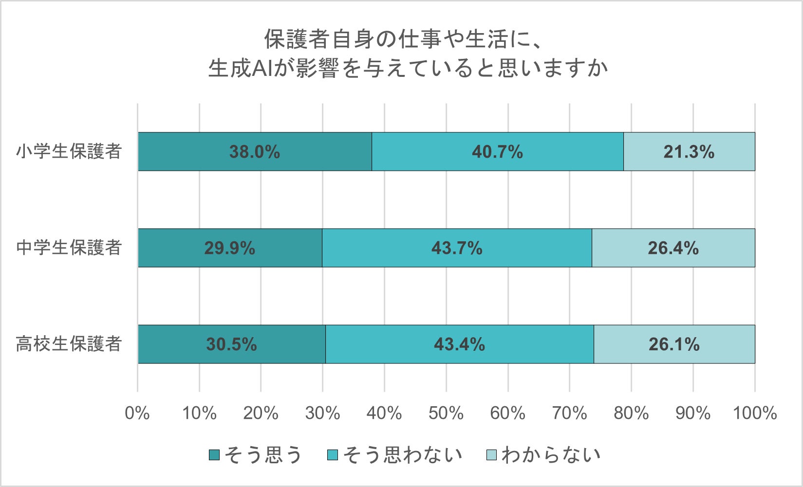 生成AIの影響について、保護者自身の仕事や生活に与える影響と、子どもの将来の職業選択に与える影響について、保護者に聞いた。