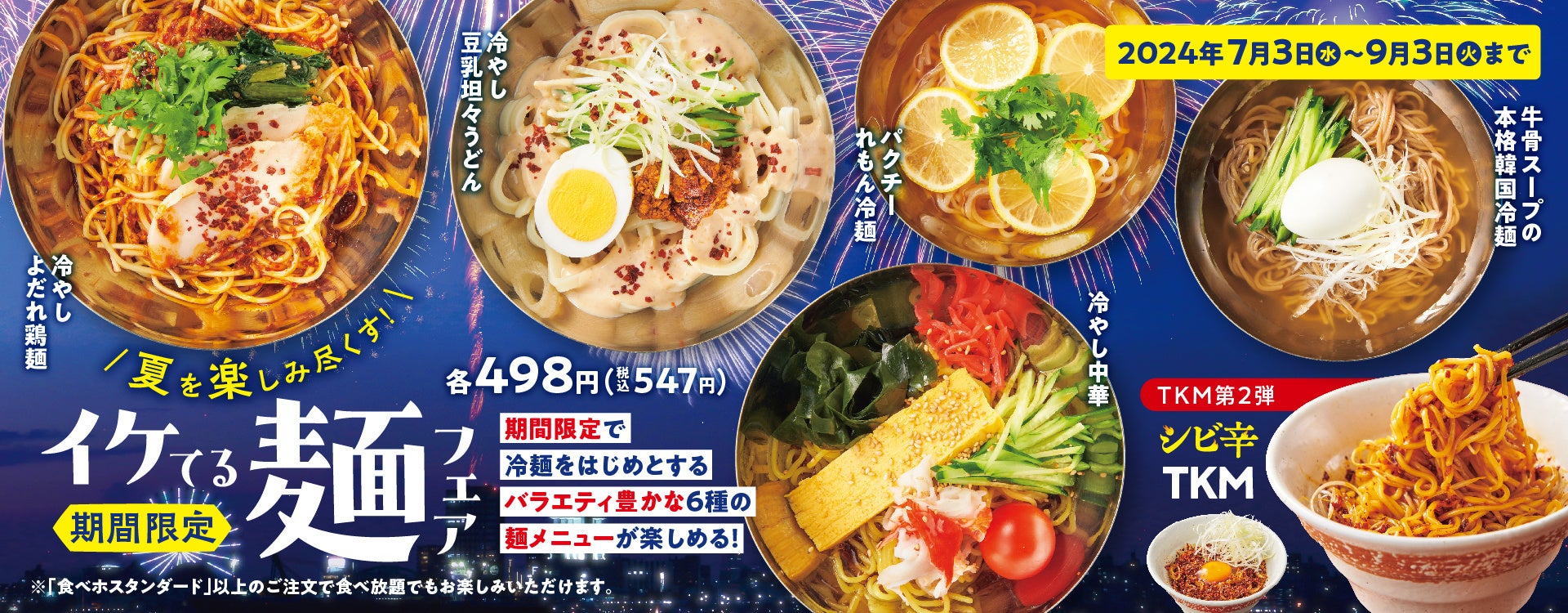 すべてのメニューは単品注文だけでなく、食べ放題メニューとしても「食べホスタンダード」以上のプランでご注文が可能です。友人やパートナーと一緒に、もちろんひとり焼肉でも、バラエティ豊かな「イケてる麺フェア」で焼肉時間を楽しみ尽くしてみてはいかがですか。ぜひこの機会に気軽にお立ち寄りください。