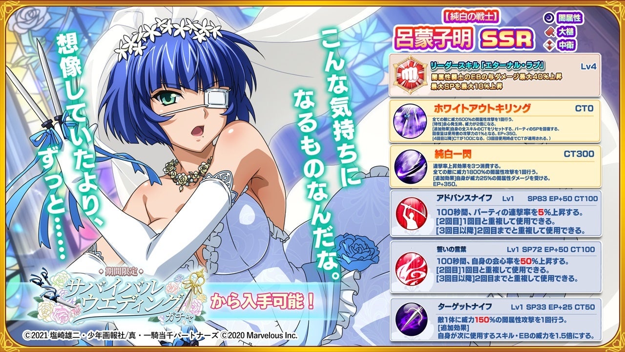 本日開始の「サバイバルウエディングガチャVol.1」では、新たに「【純白の戦士】呂蒙子明」(CV:甲斐田裕子)」が登場。