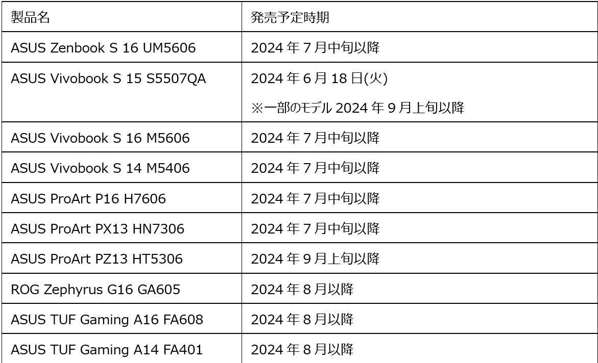 ※2024年7月26日(金)更新: ASUS Vivobook S 15 S5507QAおよびASUS ProArt PZ13 HT5306の発売予定時期に変更がありましたため修正いたしました。