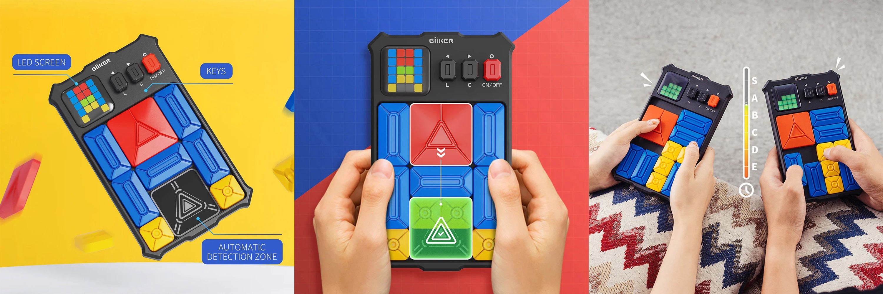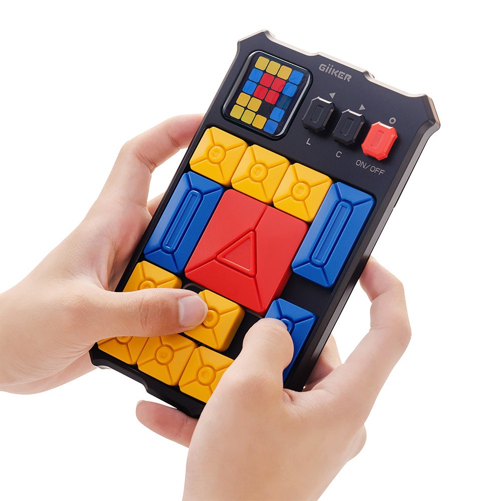 シンプルで直感的な、スライド式パズルゲーム。500以上のパズルを通して、あなたの空間把握能力を鍛えましょう。左上のLEDスクリーンに表示された通りに赤、黄、青のプラスチックピースを並べ、赤い大きなピースをボード中央下のEXITスペースまで移動きれば問題クリア。ピースが収まれば、自動的に次のパズルに進むことができます。解答につまづいたら、ゴールに至る各ステップを一手ごとに教えてくれる「学習モード」や、あなたの解答時間に基づいて6段階にレベルを判定する「チャレンジモード」など機能満載。大人も子どももデジタルデバイスを手放して頭を鍛えるのに最適なゲームです。また、手のひらサイズの小型デザインなので、持ち歩きや旅行にも最適。