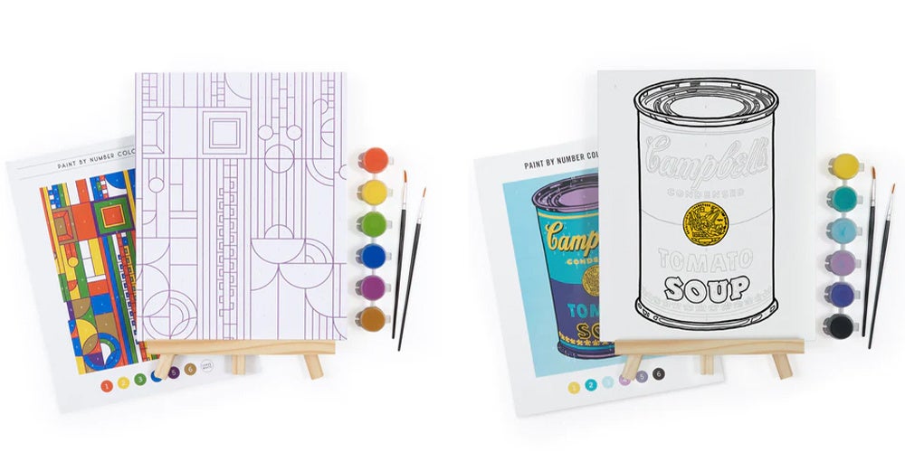 著名な建築家、Frank Lloyd Wright(フランク・ロイド・ライト)が描いたアリゾナの風景画の複雑な線と鮮やかな色や、偉大なポップアーティスト、Andy Warhol(アンディ・ウォーホル)の象徴的な作品『Campbell's Soup Cans』(キャンベルスープ缶)を番号順に塗って再現する、レベルの高いペイントキット。番号に従うだけなので、絵画経験を問わず、誰でも楽しめます。本物のキャンバス、アクリル絵の具、木製イーゼル付きなので描く意欲をそそられます。完成したら、棚やデスク、サイドテーブルに自分の小さな傑作を飾ってみましょう。