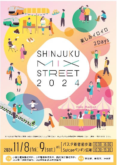 小田急電鉄株式会社、京王電鉄株式会社、西武鉄道株式会社、東京地下鉄株式会社、東日本旅客鉄道株式会社が共同して、2024年11月8日(金)、9日(土)に、甲州街道(バスタ新宿前)歩道・Suicaのペンギン広場にて、公共空間等を活用した賑わいの創出を目指す「SHINJUKU MIX STREET 2024」を開催します。