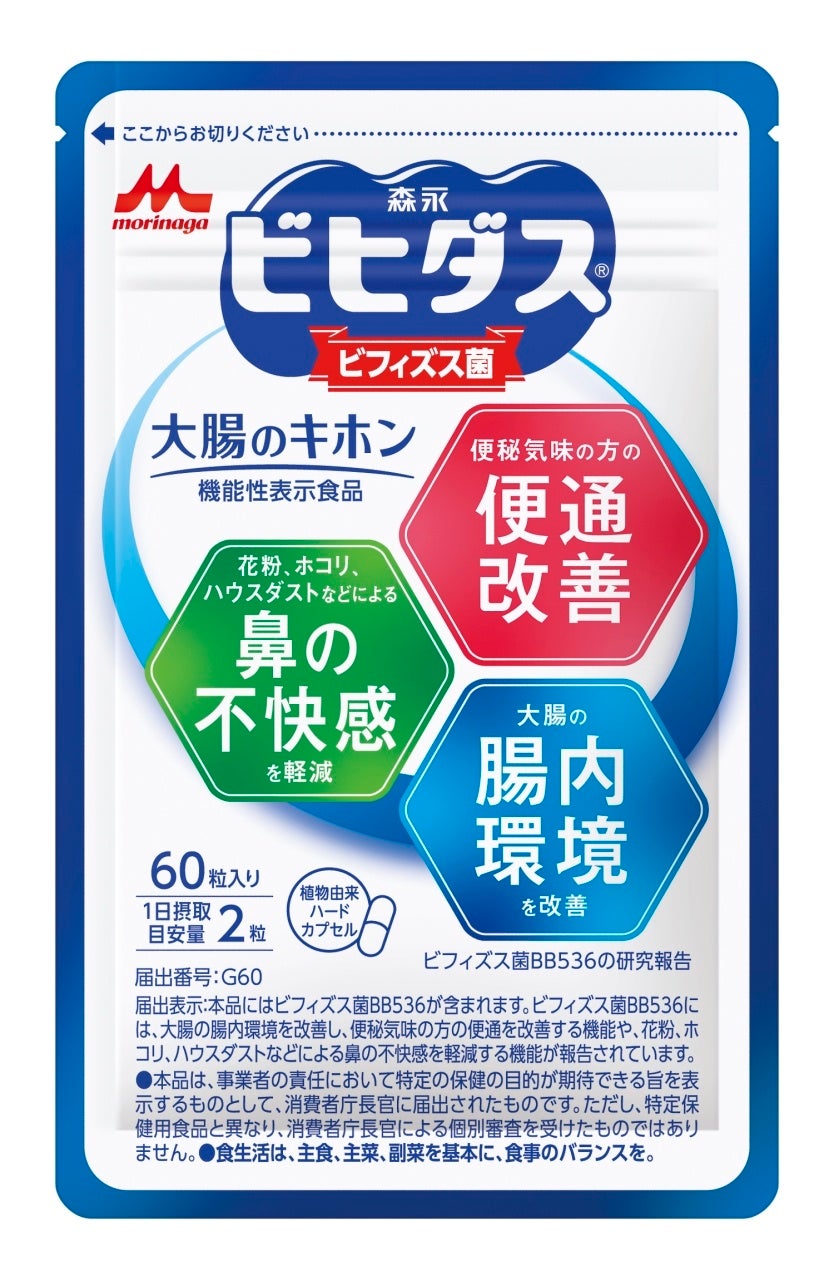 「森永ビヒダス 大腸のキホン」は、ビフィズス菌BB536を関与成分とする機能性表示食品のサプリメントです。ビフィズス菌BB536には、大腸の腸内環境を改善し、便秘気味の方の便通を改善する機能や、花粉、ホコリ、ハウスダストなどによる鼻の不快感を軽減する機能が報告されています。※通販限定商品です