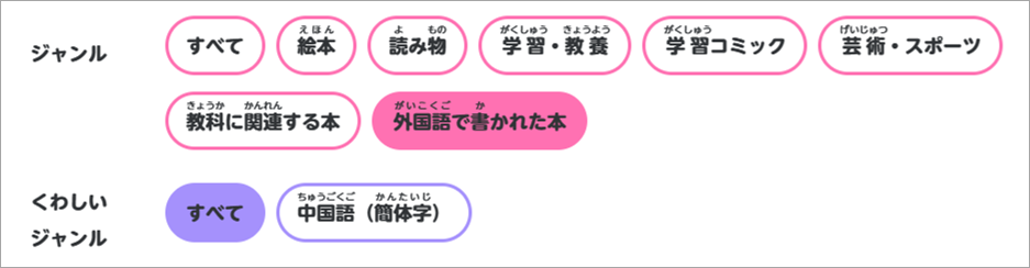 「くわしくさがす」>「ジャンル」にて、「外国語で書かれた本」を選択することで、該当タイトルを一覧で確認することが可能です。