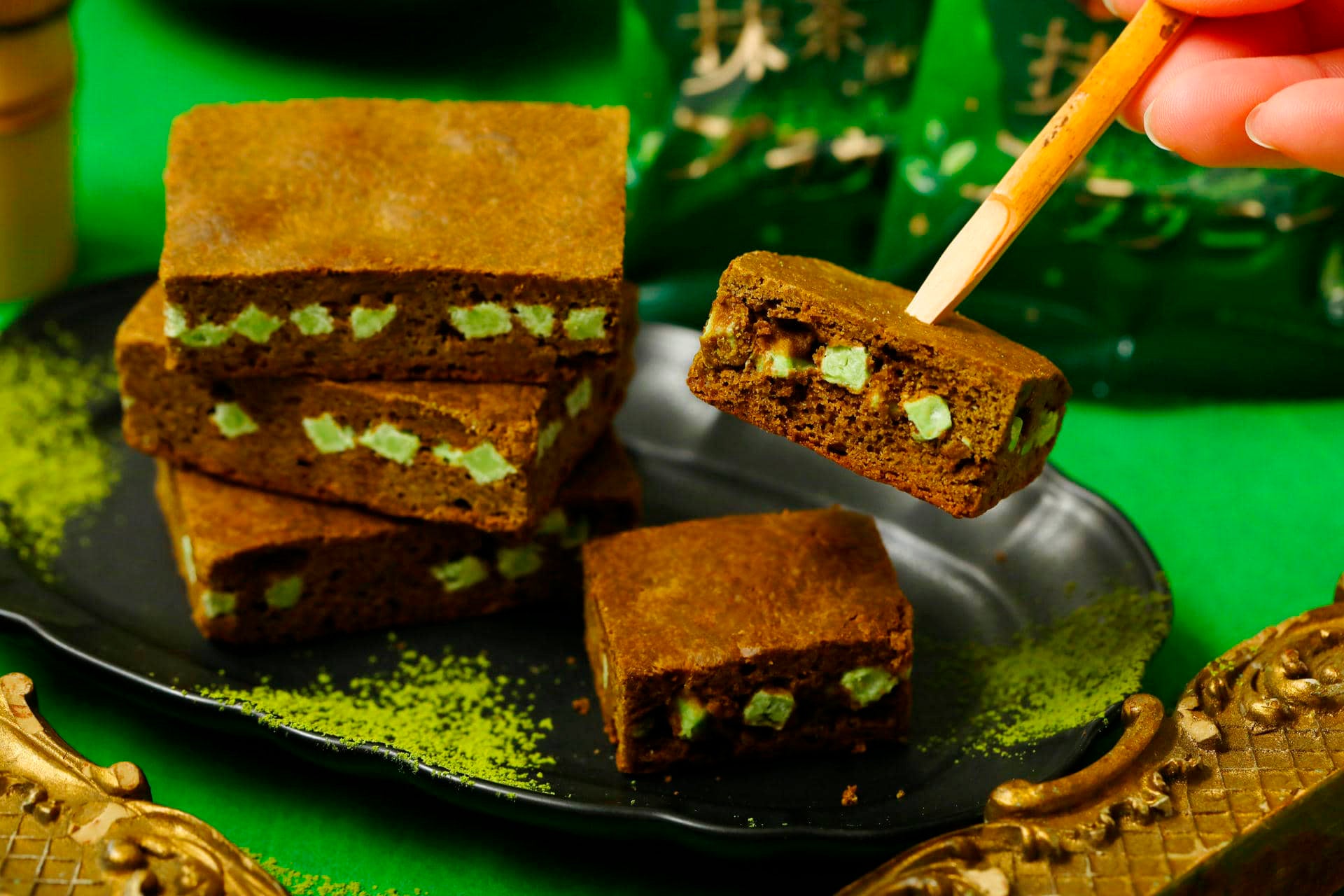 には抹茶の深みを表現したグリーンに華やかなゴールドを合わせ、シックなデザインに仕上