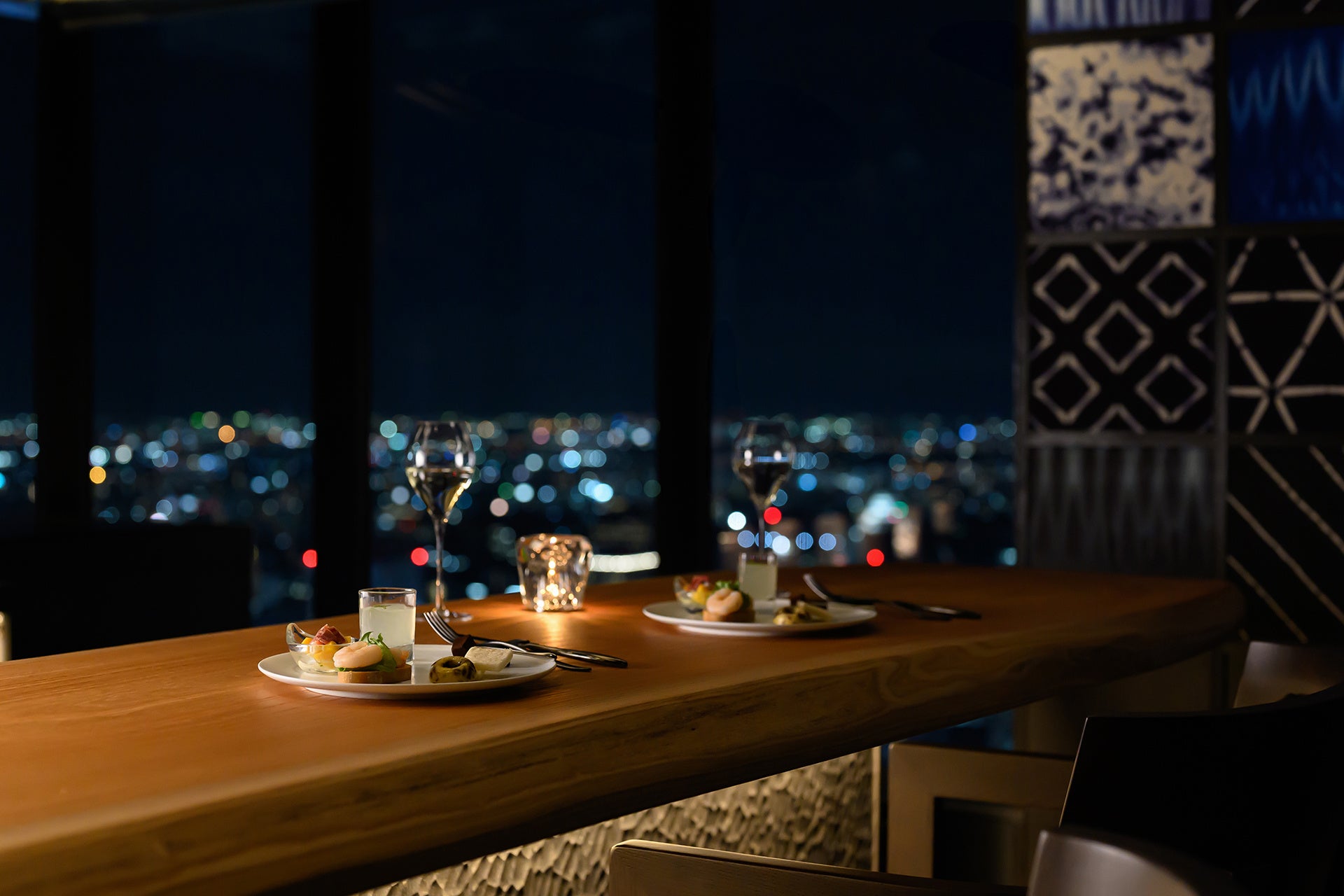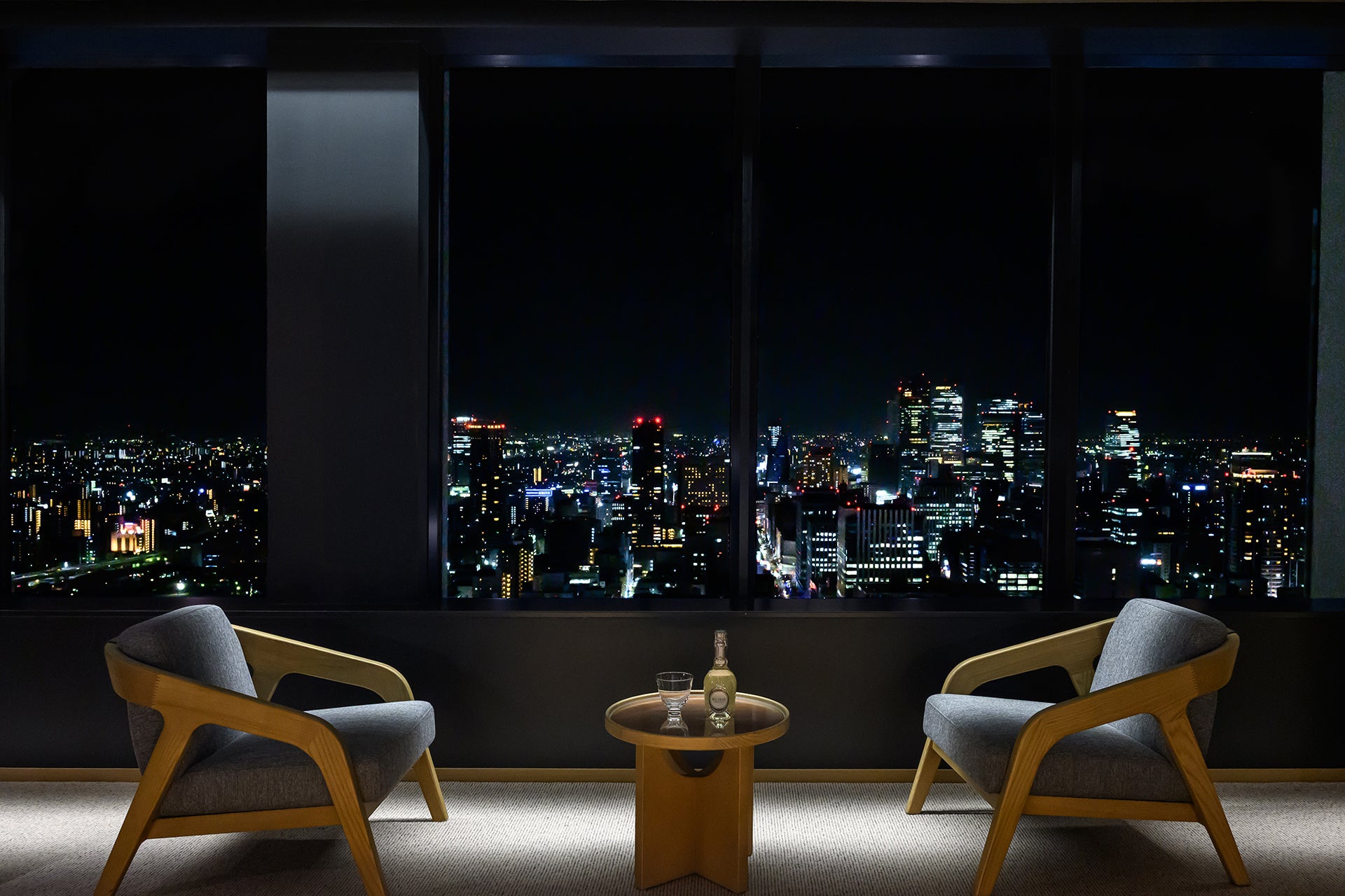 扉をあければ名古屋の街の夜景がきらめき、有松絞の優美な柄が目をひくアートワークと、美しい木目が特徴の岐阜県産欅の一枚板カウンターが迎える、洗練された大人の遊び場です。スパークリングワインやウイスキーなどのフリーフローと、24F「中国飯店 BAR 蒼」のフレンチオードブルプレートをご提供します。大切な方とゆっくりと語らいながら、日常の喧騒から離れ心を整える滞在に、ここでしか叶わない、上質な時間をお過ごしください。