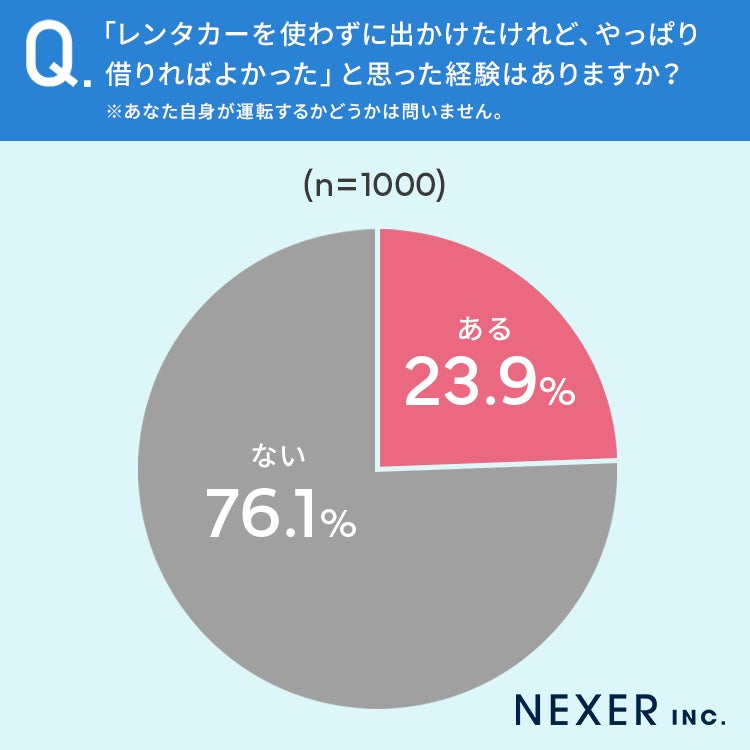 ■「レンタカーを使わずに出かけたけれど、やっぱり借りればよかった」と思った経験、23.9%が「ある」