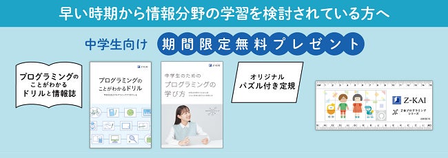 株式会社増進会ホールディングス(Z会グループ)のグループ会社である株式会社Z会は、年長~中学生向けの自宅で学べる「Z会プログラミングシリーズ」において、資料請求いただくと期間限定の特典を無料プレゼントするキャンペーンを2024年10月9日(水)~2024年12月5日(木)の期間限定で実施中です。プログラミングに触れてみたい、プログラミングを得意にしたい方におすすめです。