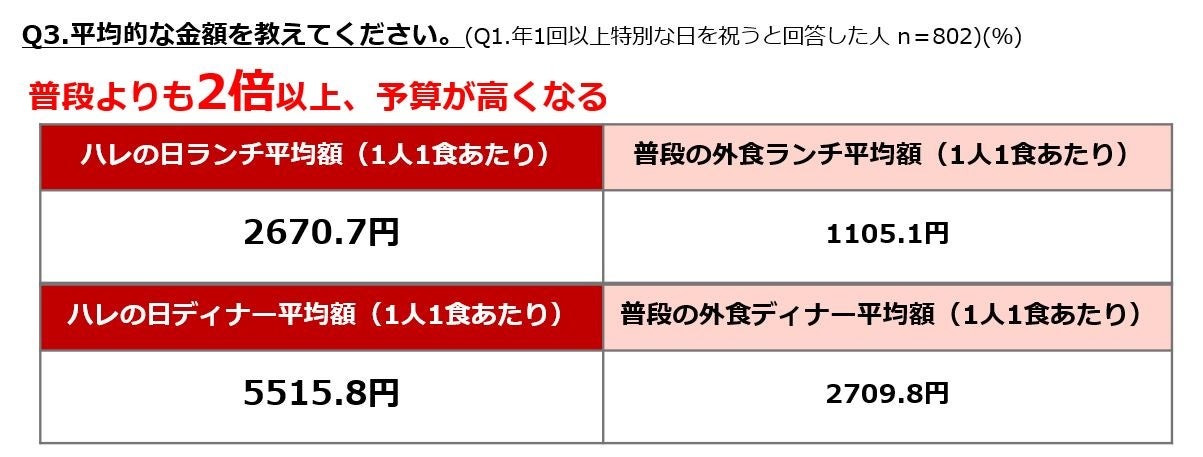 ハレの日外食は普段よりも高めの予算設定の方が多く、特にディナーについては平均で2倍以上となりました。
