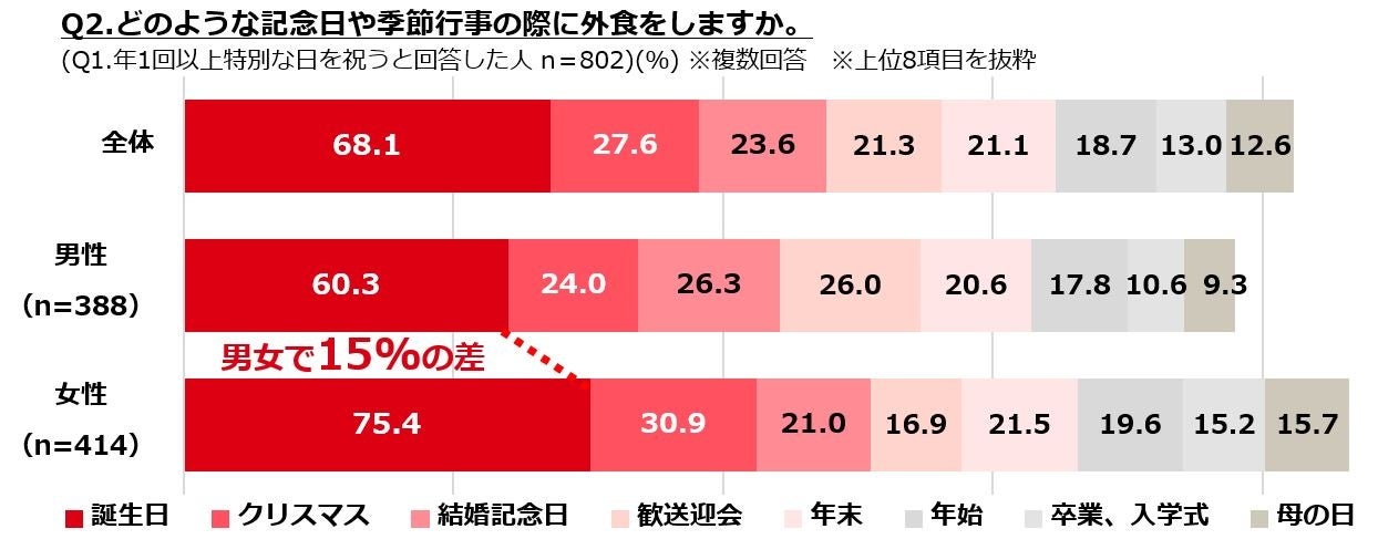 また、ハレの日外食で「飲食店を選ぶポイント」をみると「誕生日・記念日特典がある」が、男性で約2割なのに対し、女性では約4割が回答。予算は奮発しつつ、特典の恩恵も受けてさらに豪華なハレの日外食にしようと考える女性が多いのかもしれません。