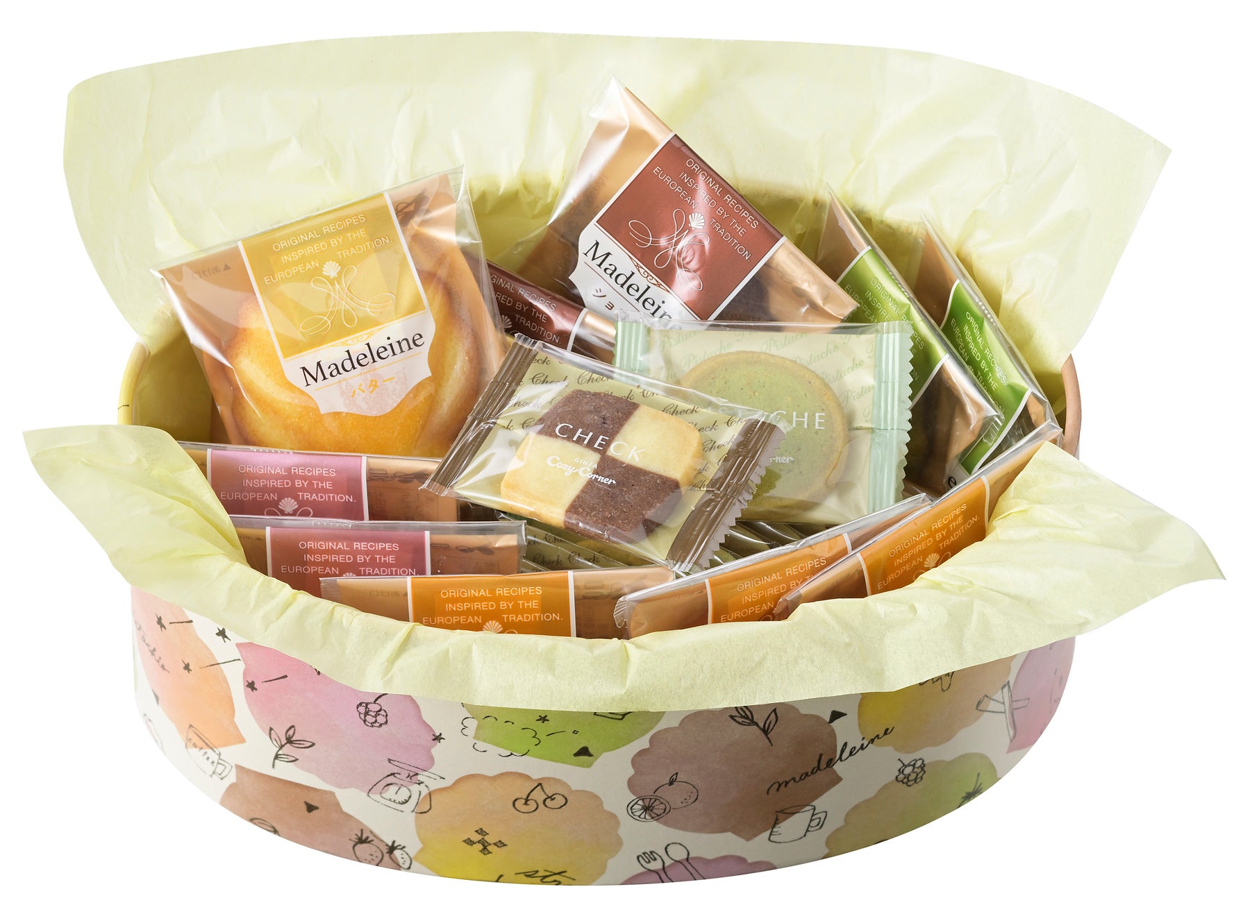 素材の味をいかして、ふんわり、しっとり焼き上げた人気のマドレーヌと、風味豊かなクッキーを詰め合わせました。12個入はふたをとって広げるとお花の形に広がるパッケージ。25個入はかわいい楕円のパッケージです。