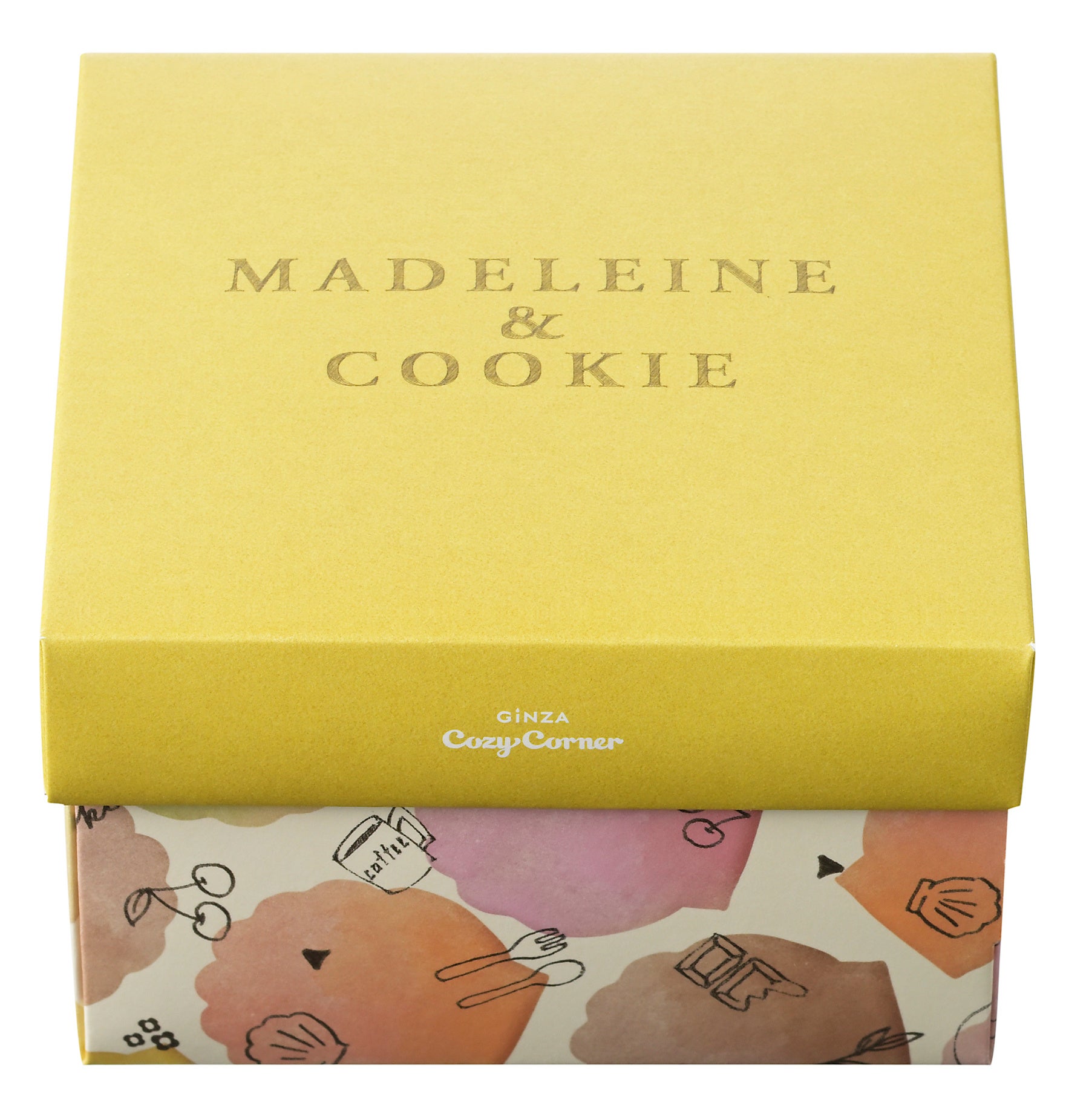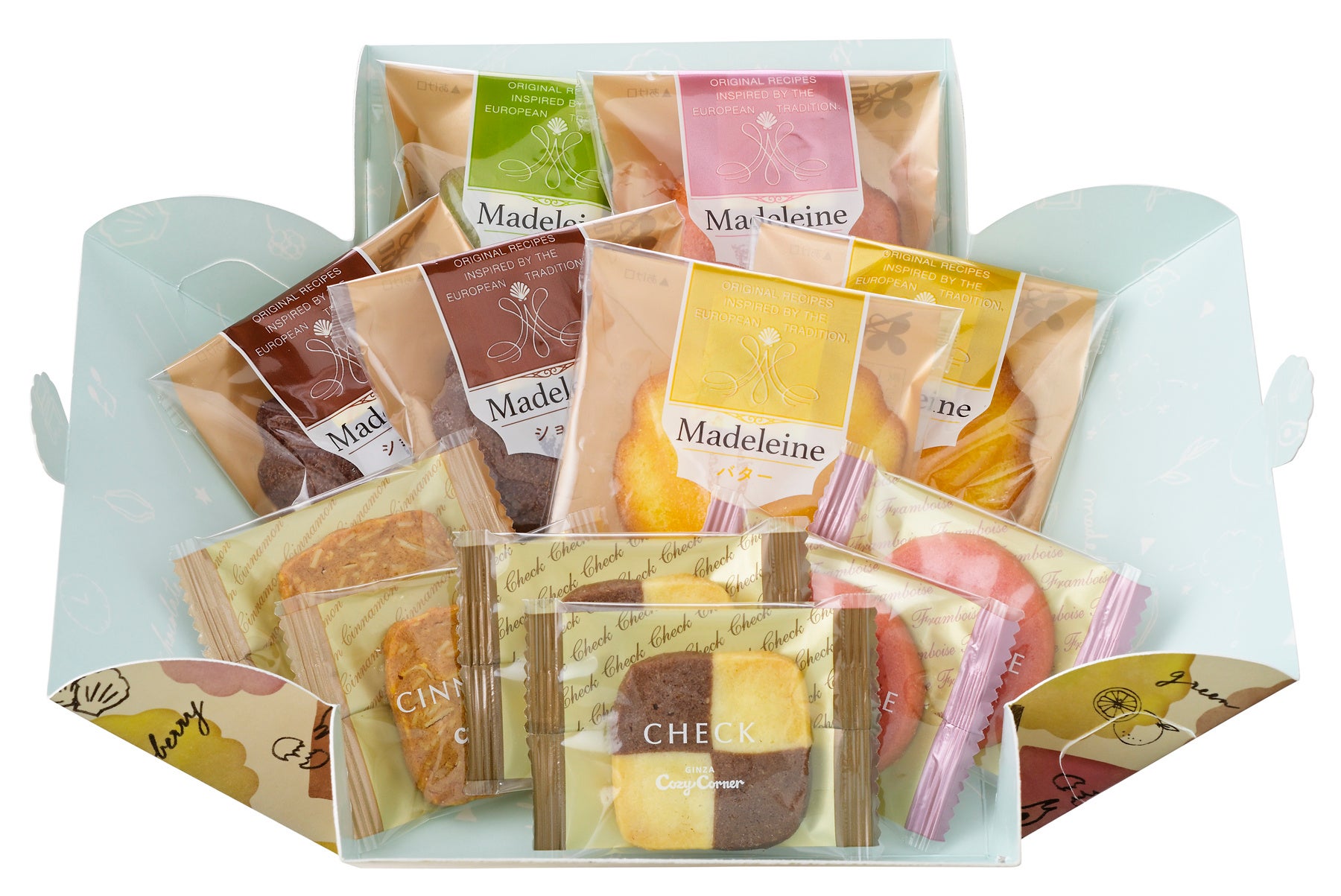 ●12個入:マドレーヌ(バター、ショコラ)各2個、マドレーヌ(いちご、抹茶)各1個、クッキー(フランボワーズ、チェック、シナモン)各2個